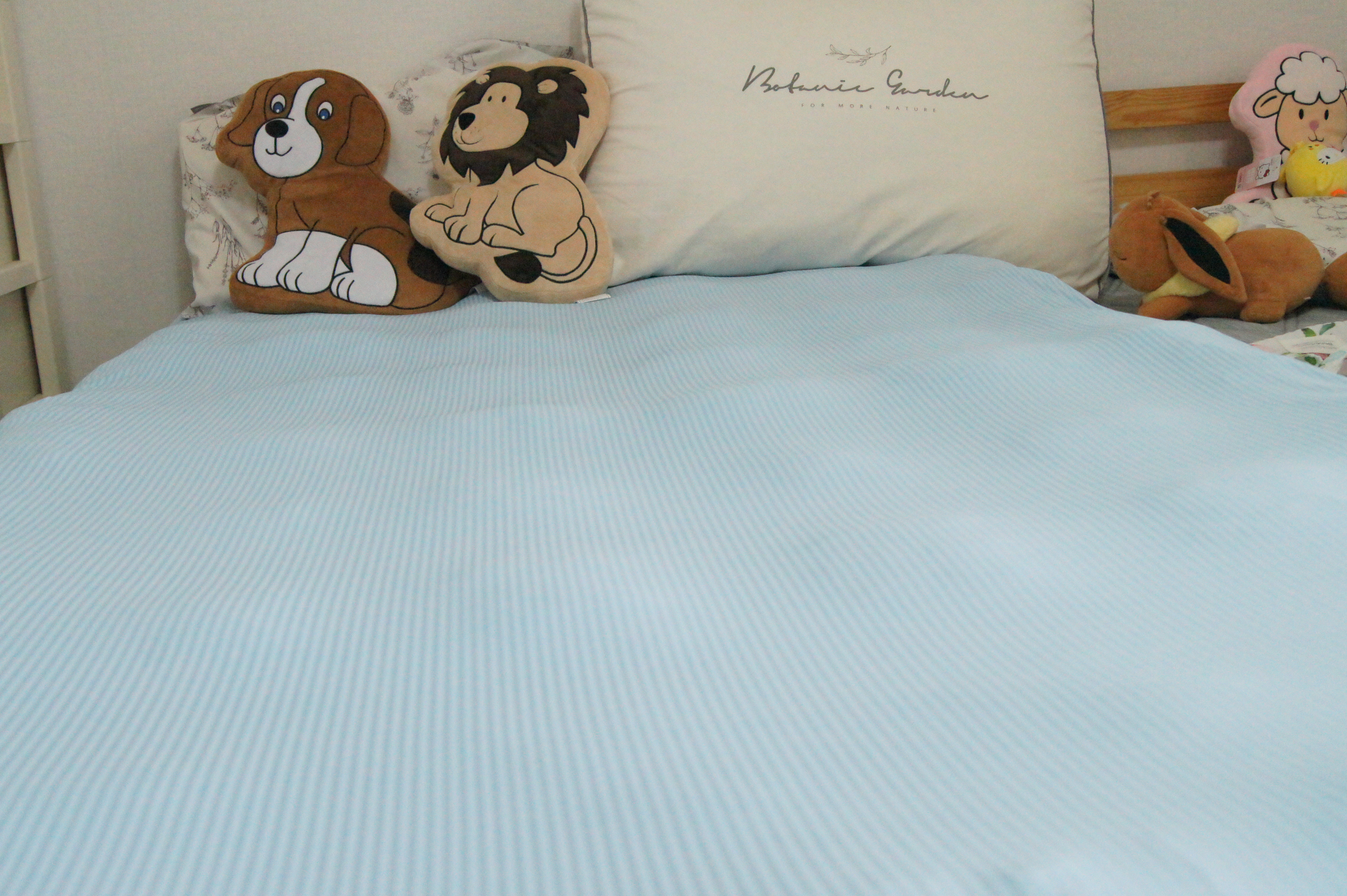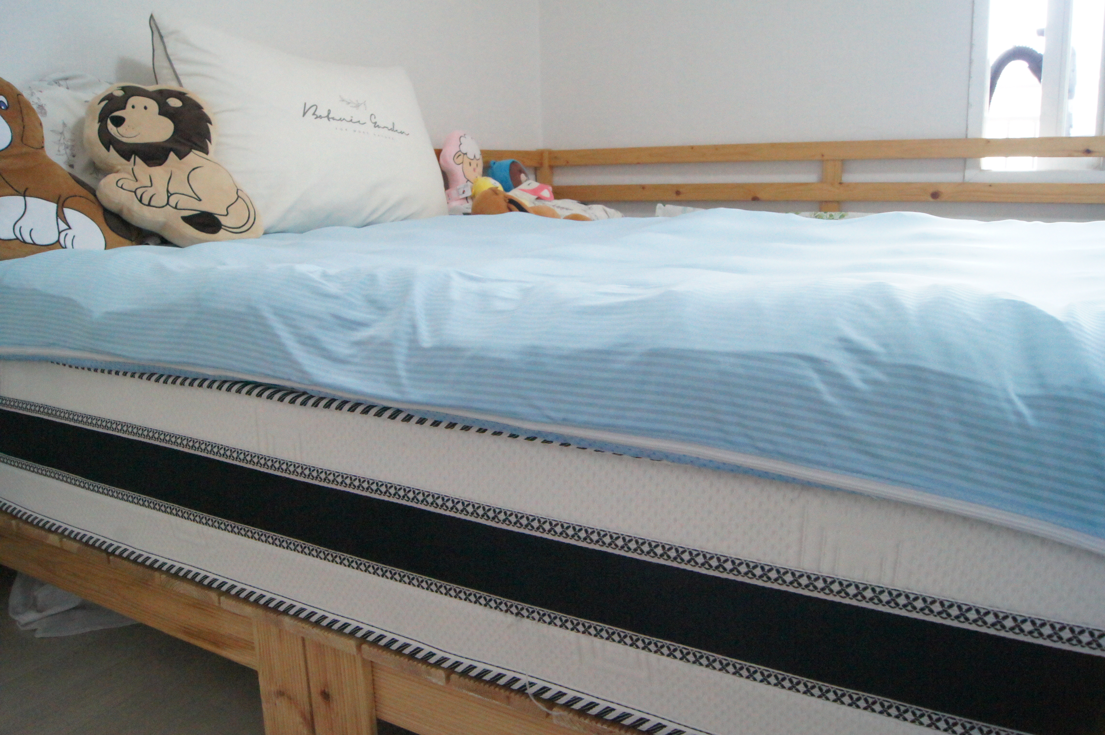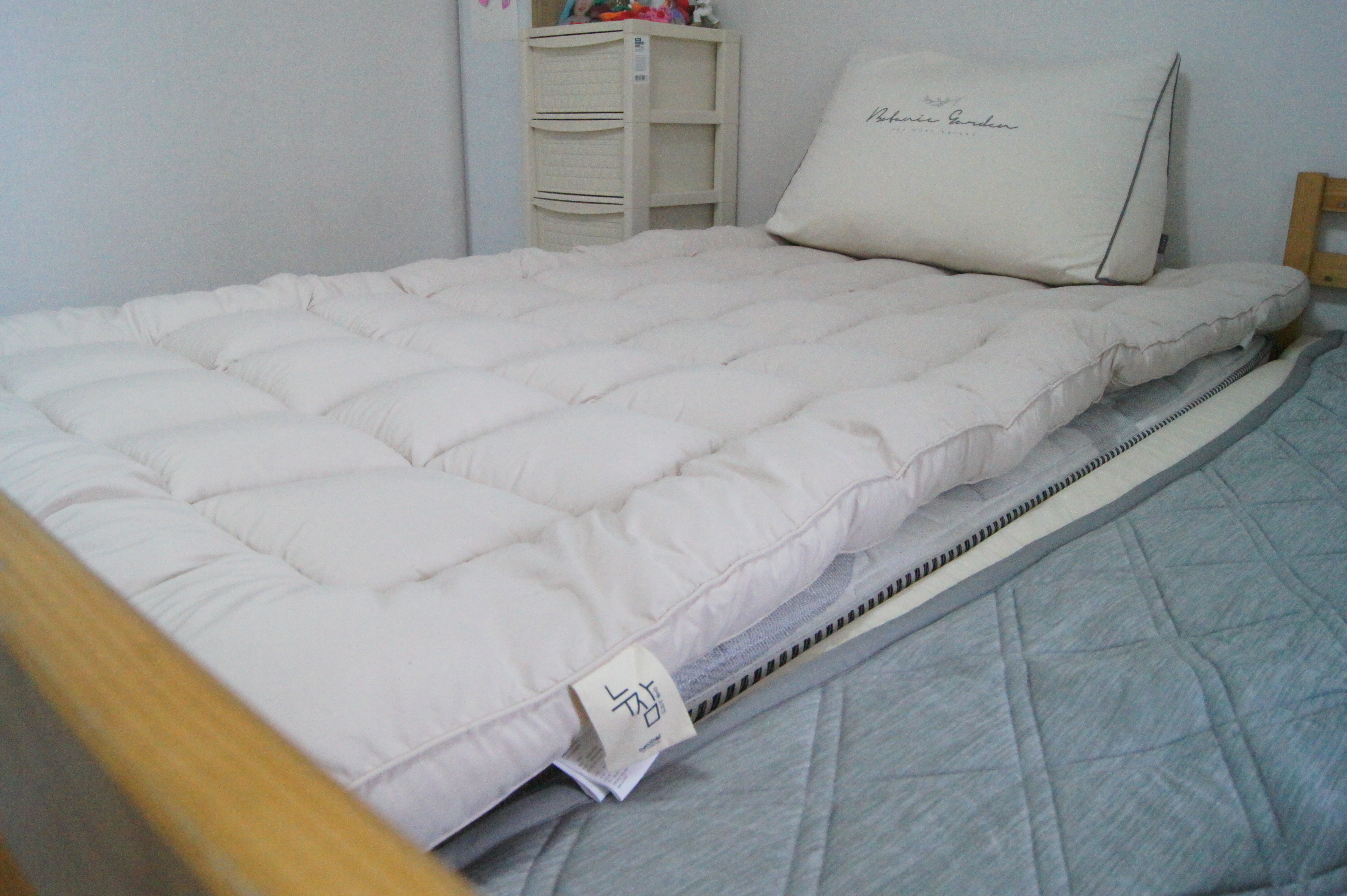아이방 침대 매트리스에 누잠 토퍼 가 설치된 모습이예요.
