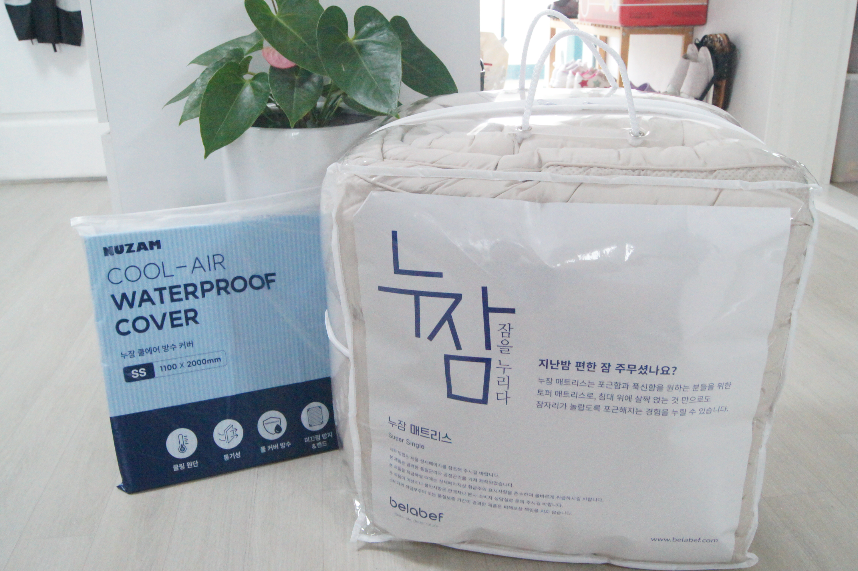 누잠 매트리스 수퍼싱글 사이즈에 방수커버 씌워진 사진인데요, 1100x2000mm 사이즈라 아이방 침대 토퍼 사이즈로 딱 좋아보였어요.