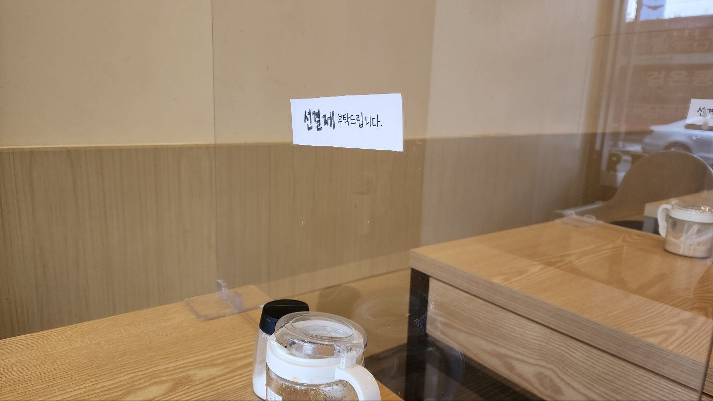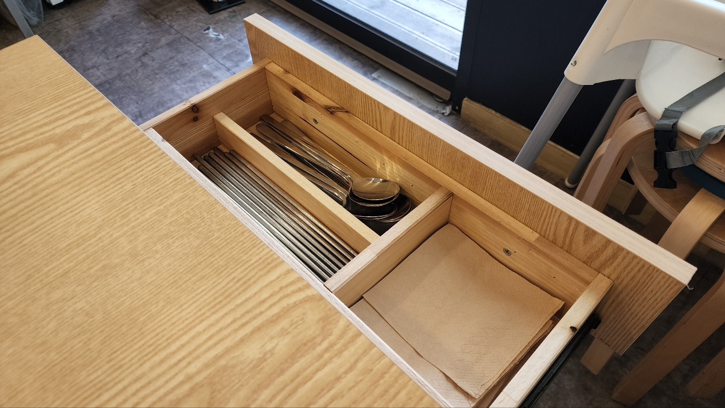 테이블이 2인, 4인 요렇게 있는데 저는 혼밥할거라 2인테이블에 앉았구요 테이블 서랍에 식기류가 있었어요.