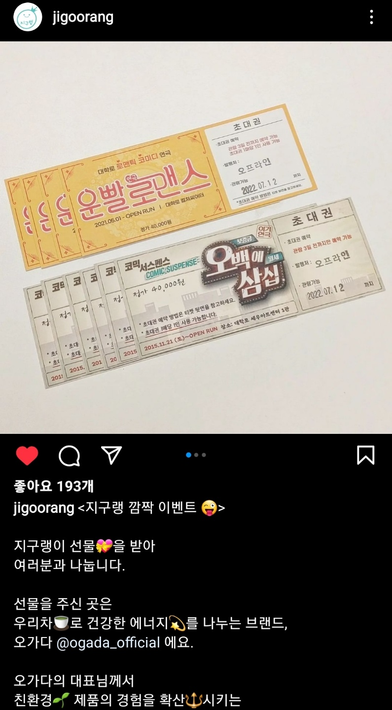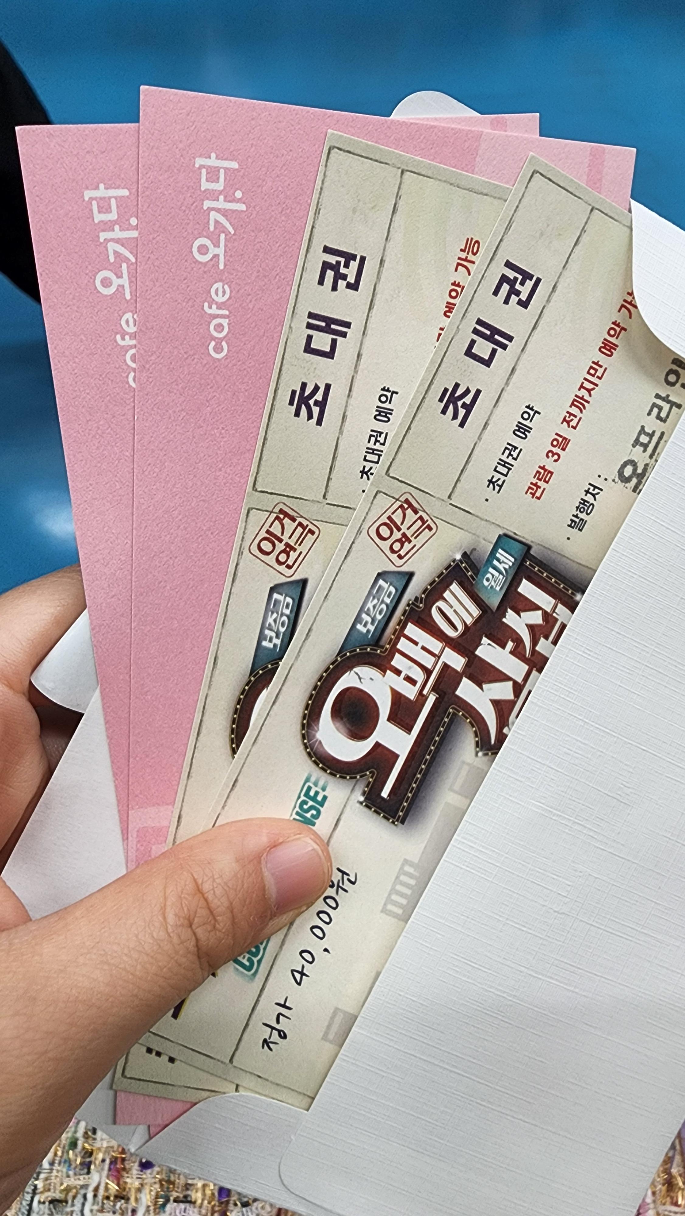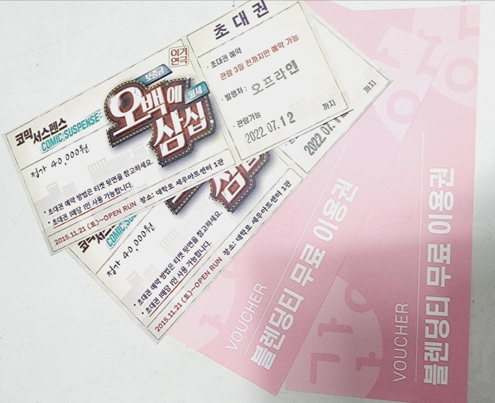 오가다 대표님께서 대학로 공연티켓과 차를 마실 수 있는 이용권을 지원해주신 것에 제가 당첨 되었네요.