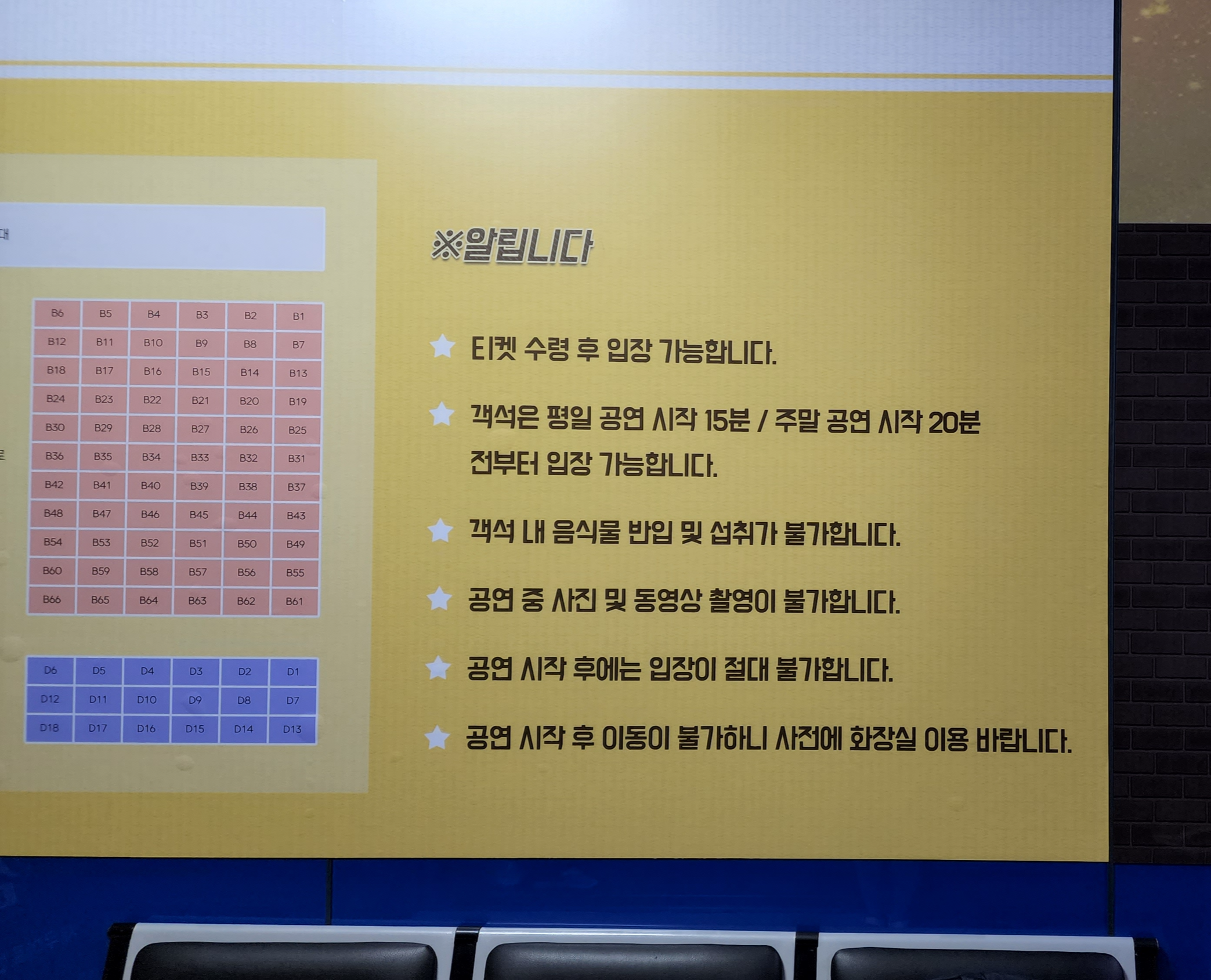객석은 평일공연 시작 15분, 주말공연 시작 20분 전부터 입장 가능하고