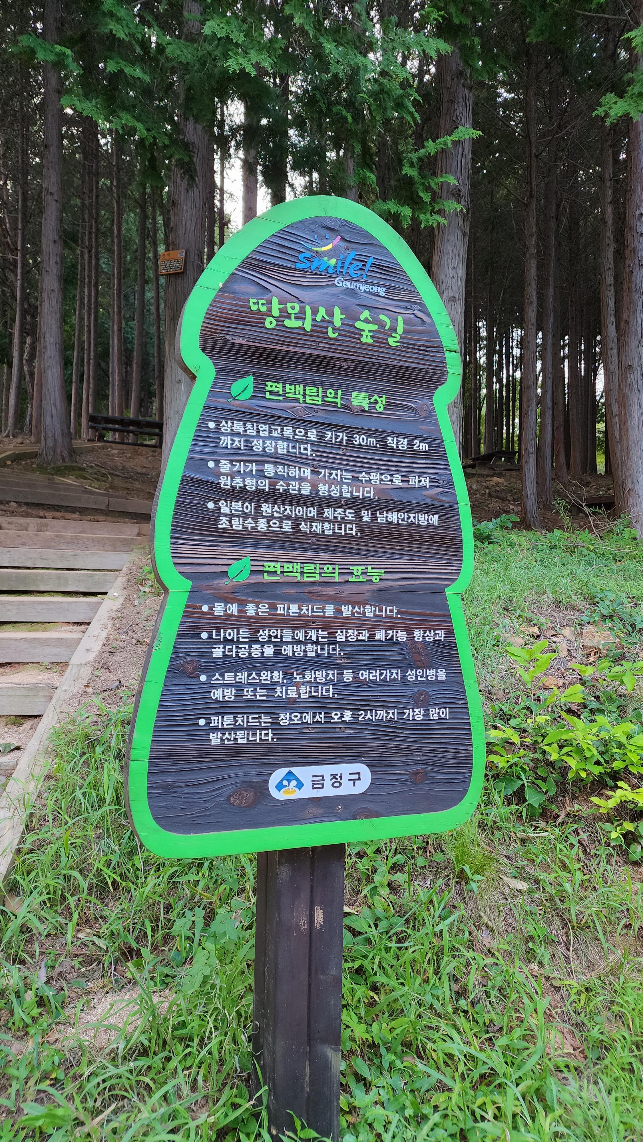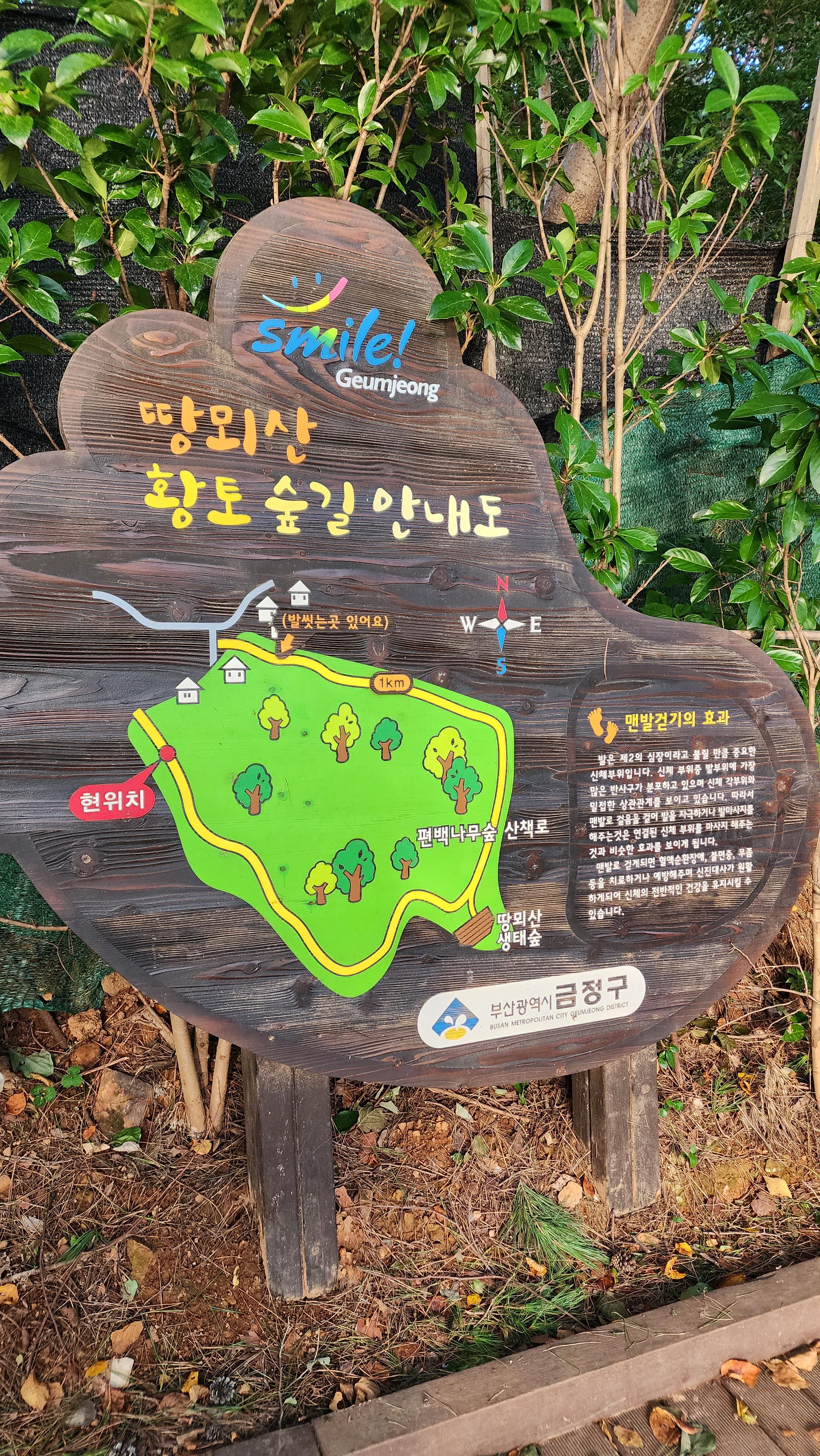 땅뫼산 생태숲, 편백나무숲 산책로, 발씻는 곳 까지 1코스로 되어있어요.