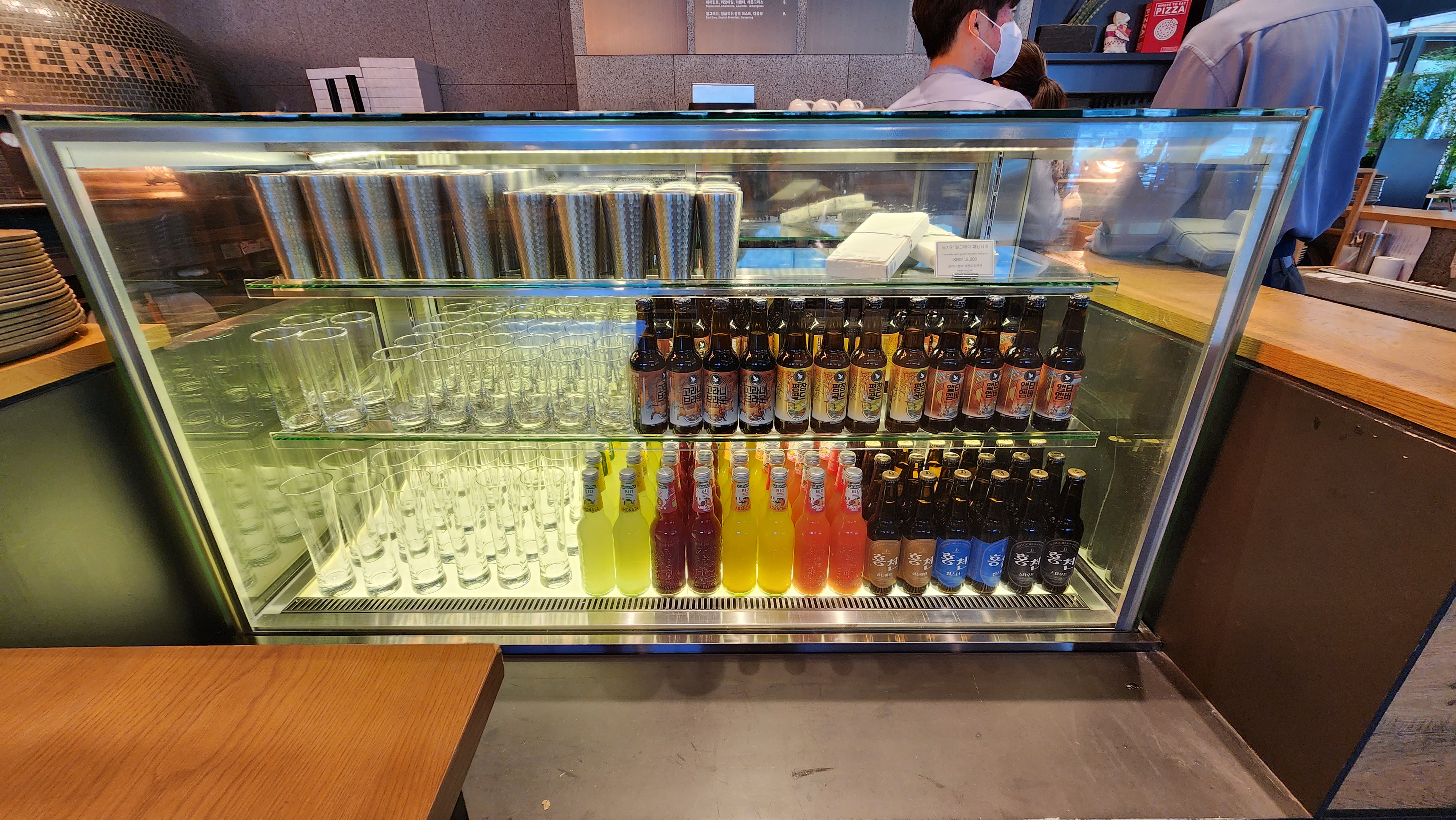 쇼케이스에 판매중인 병음료 들이 있었는데요, 지억 에서 생산되는 맥주들도 있더군요.