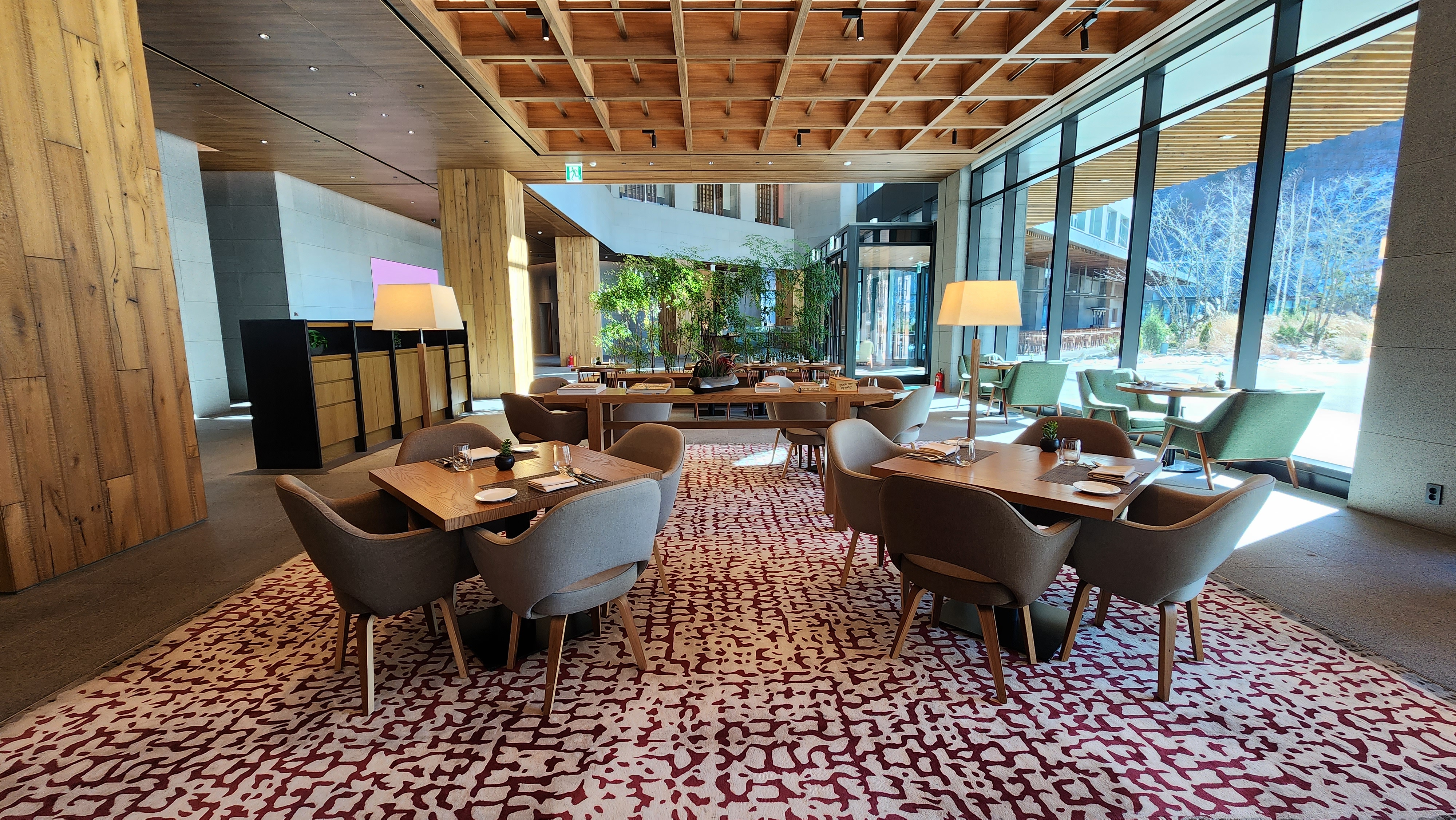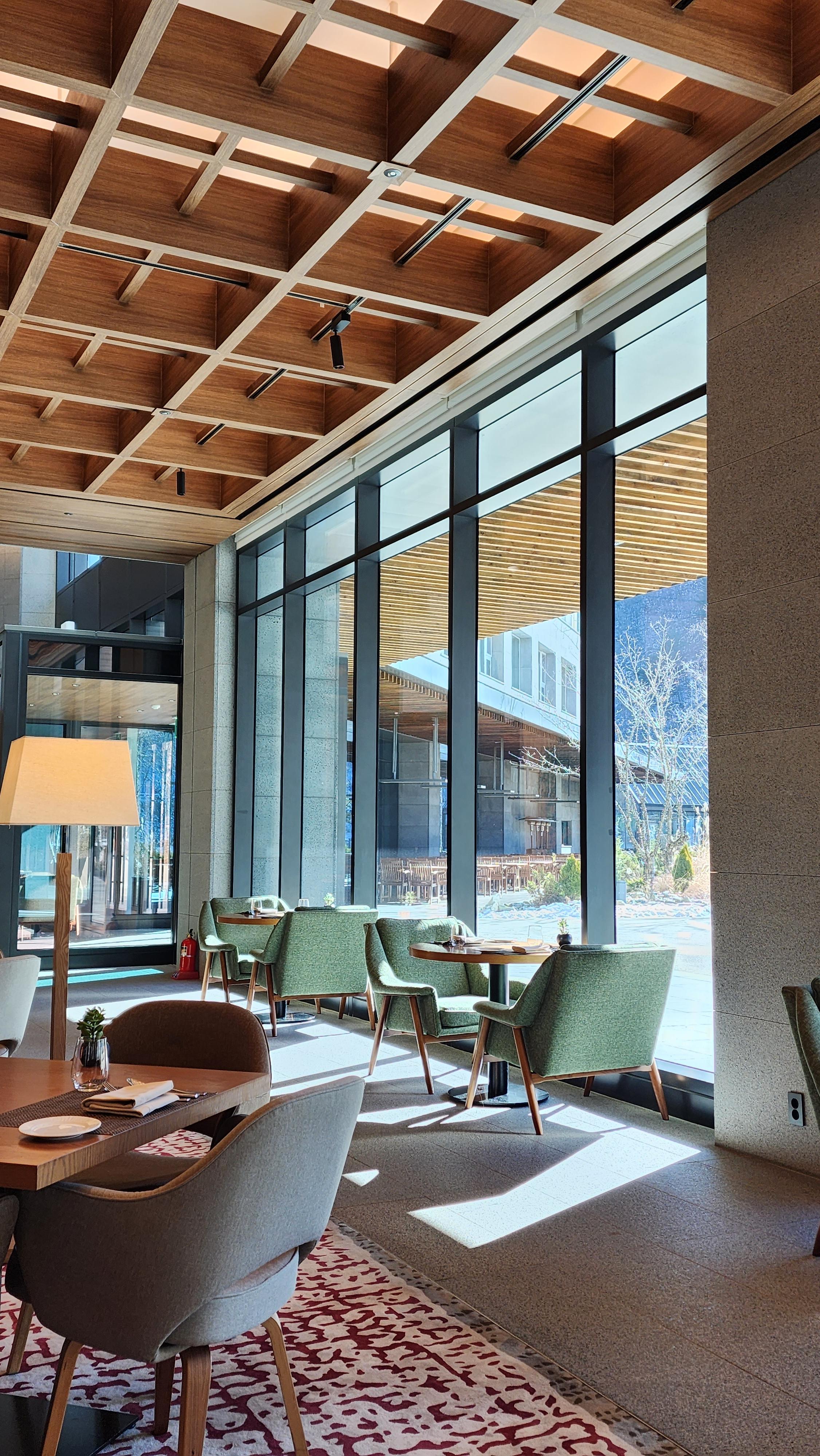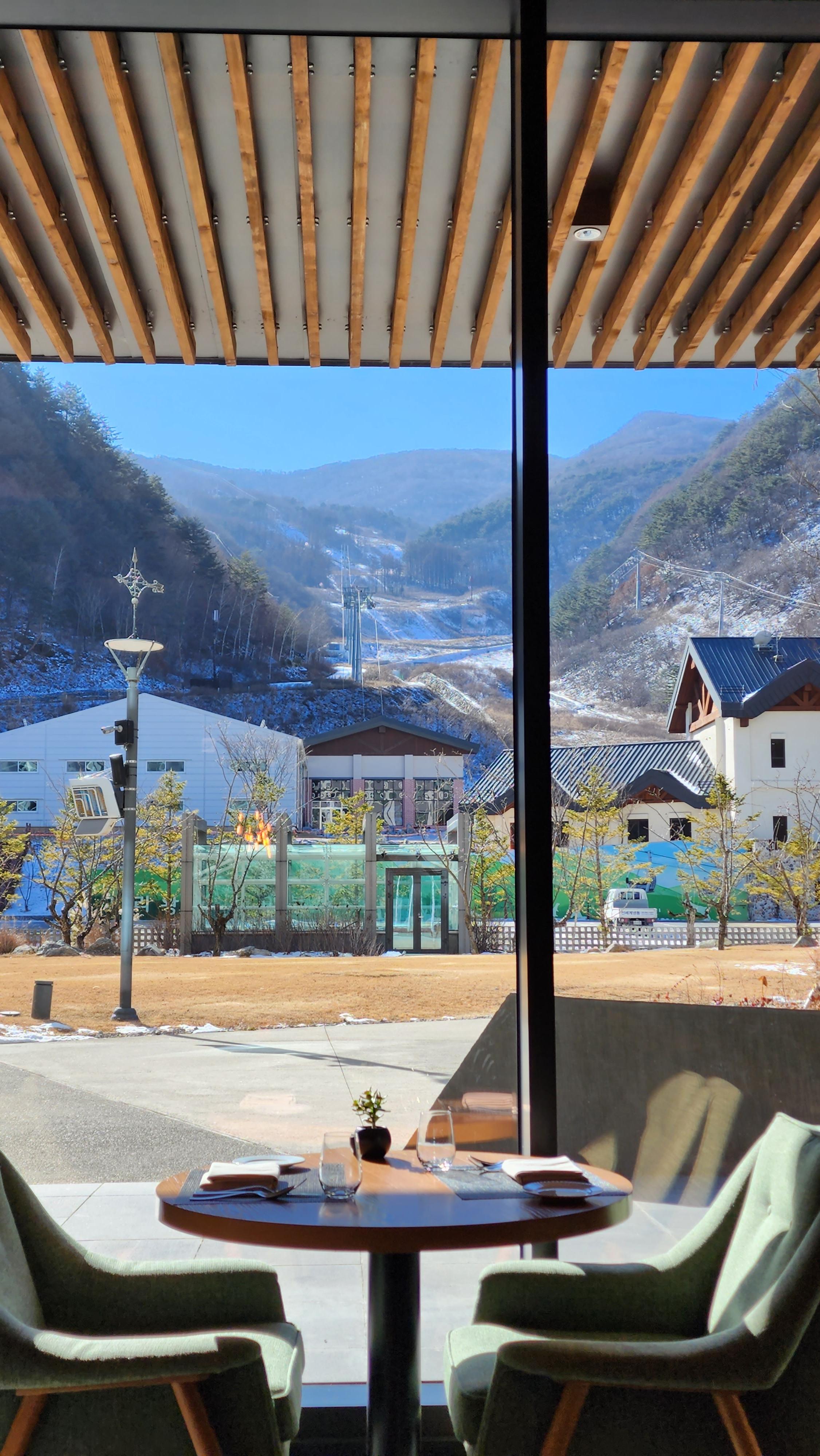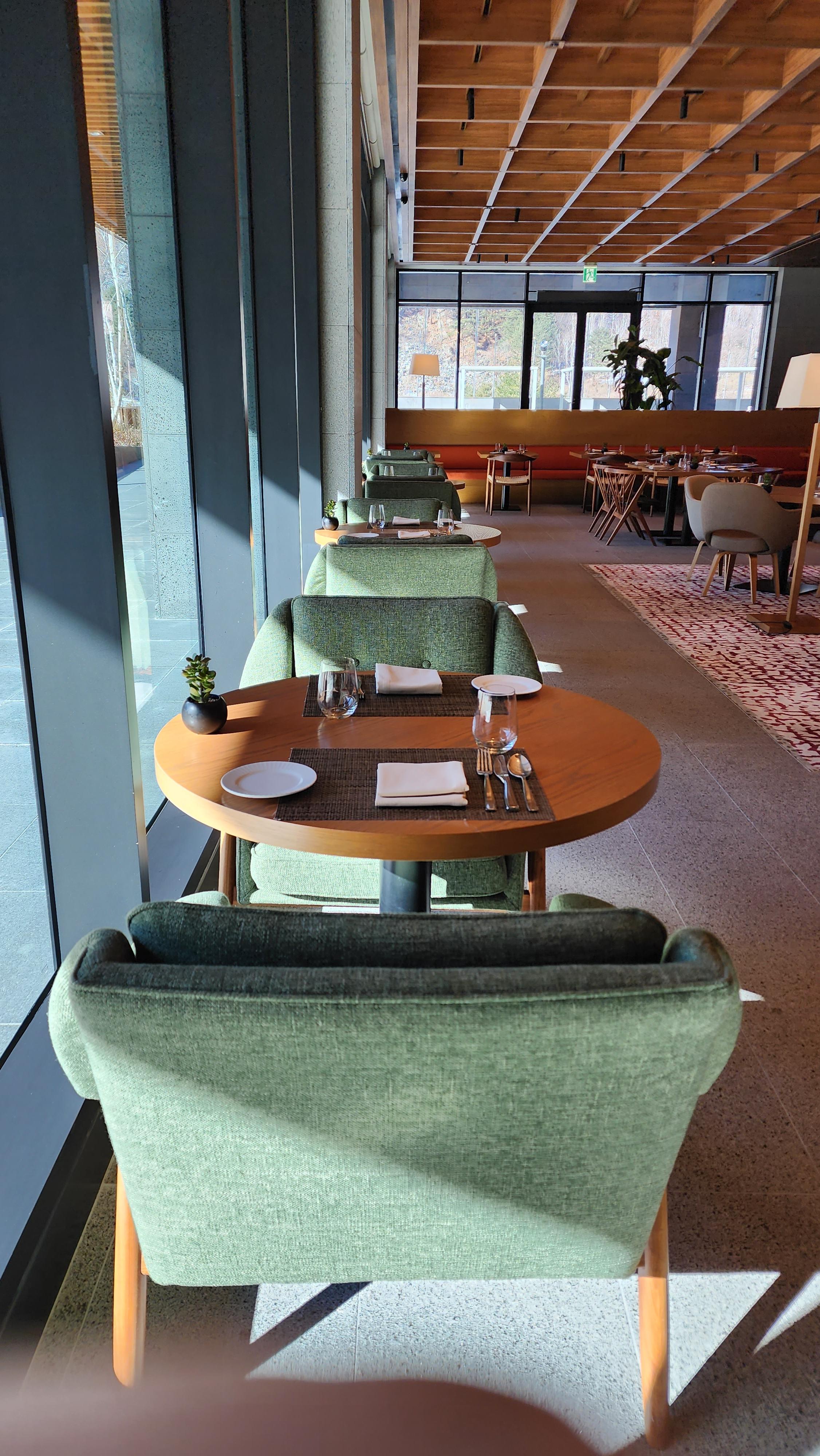 통창이라 채광이 정말 잘 되고 가리왕산 케이블카 타는 곳도 보이고, 자작나무도 멋져서 한없이 구경할만 하지만, 공간이 워낙 넓고 강원도 기온이 낮은편이라 저는 식사하면서 조금 추웠어요.