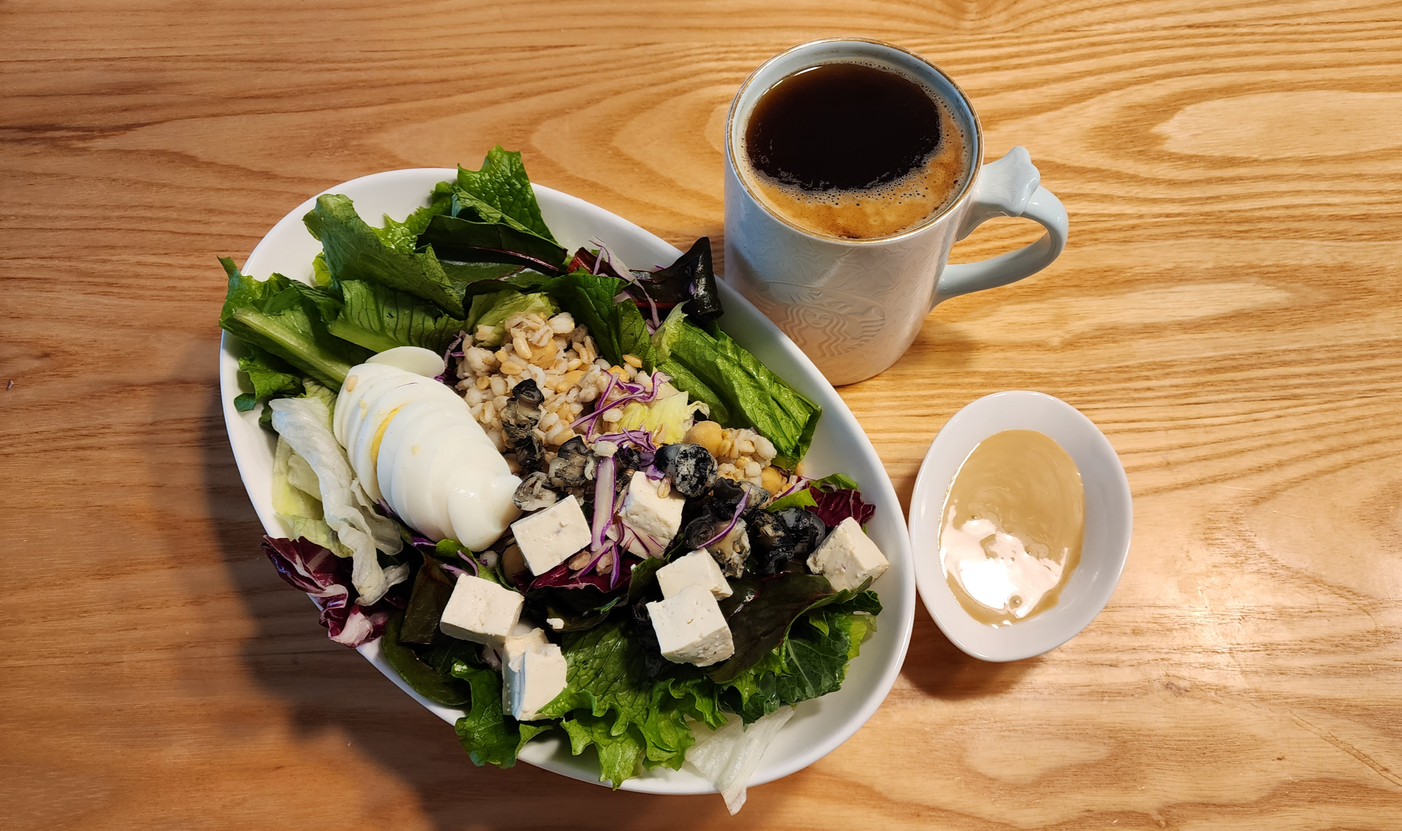 블랙올리브, 생양파, 삶은달걀(살짝 얼룩져보이는건 블랙올리브 물이 들었더라구요), 신선한 채소들이어우러진 고급진 샐러드 한상이 마련되었어요.