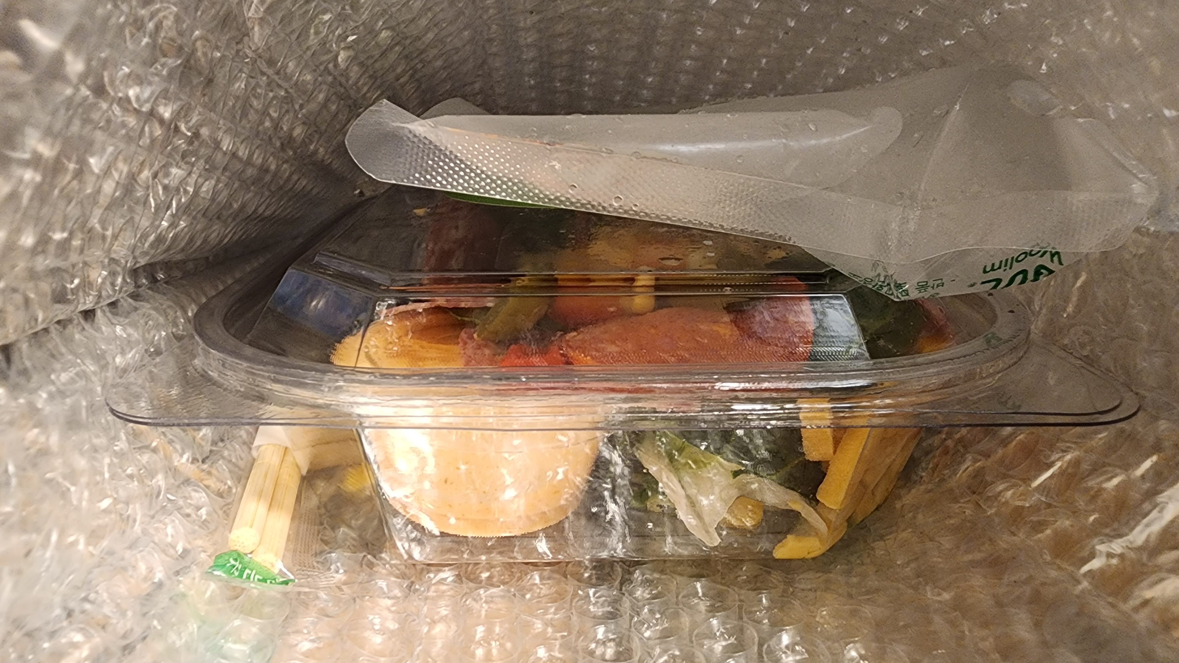 새벽에 눈 비비고 문을 열면 이렇게 샐러드가 와있다는거.