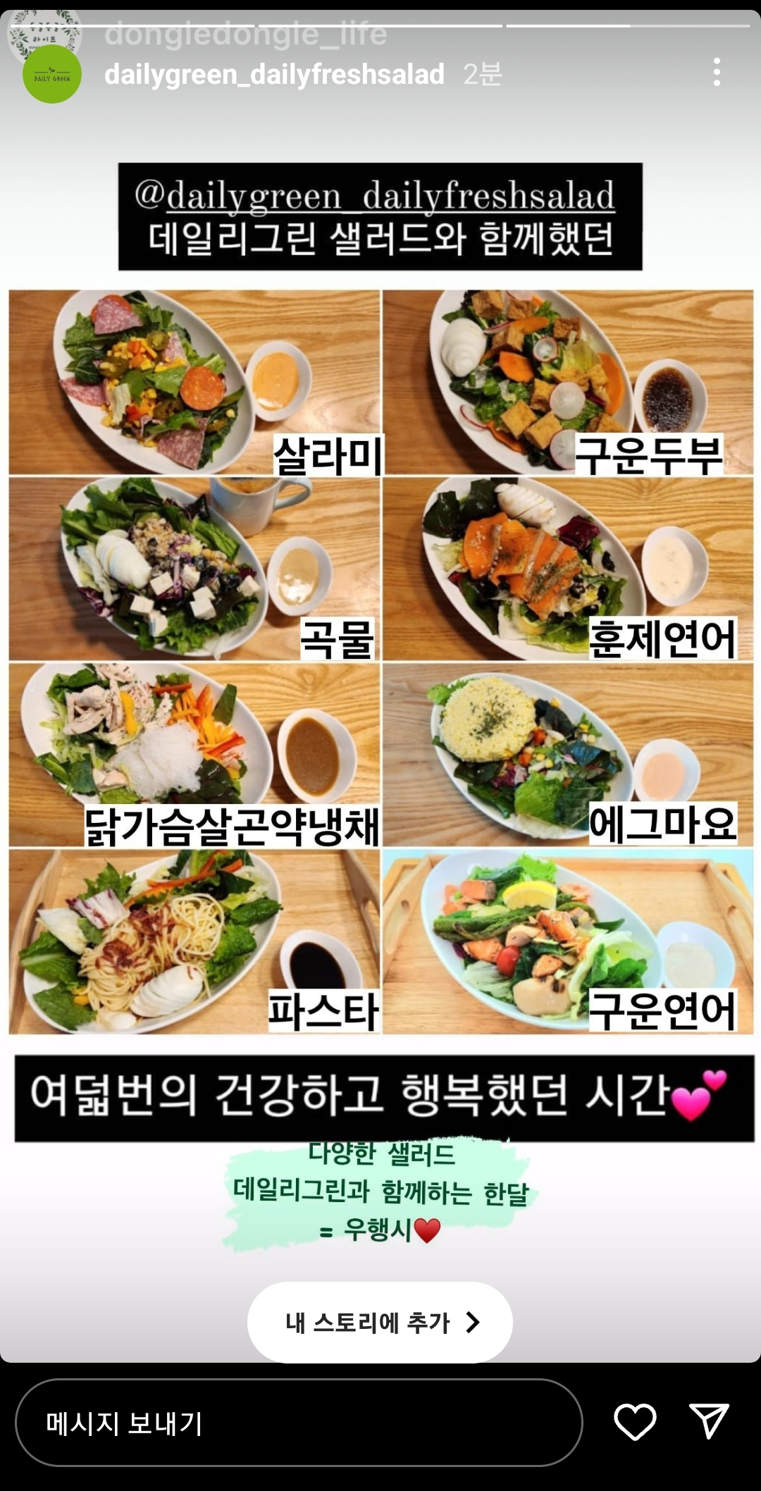 여덟가지 샐러드를 만났던 시간이 좋았어서 사진을 정리해서 인스타그램 스토리에 올렸었는데요, 데일리그린 샐러드 인스그램 계정에서 리그램 해주시면서 샐러드 사진 하나하나에 이름도 적어두셨더라구요.