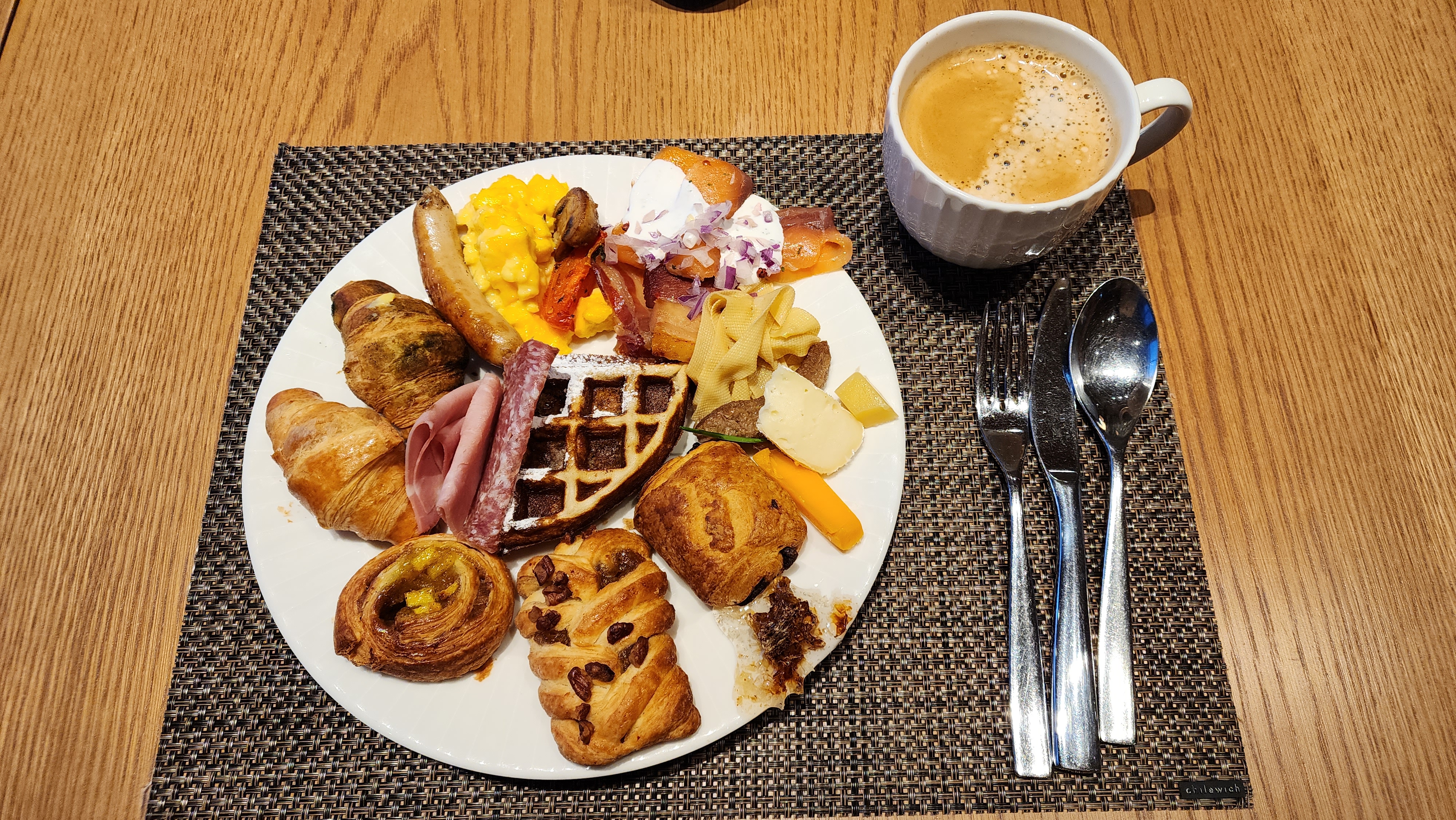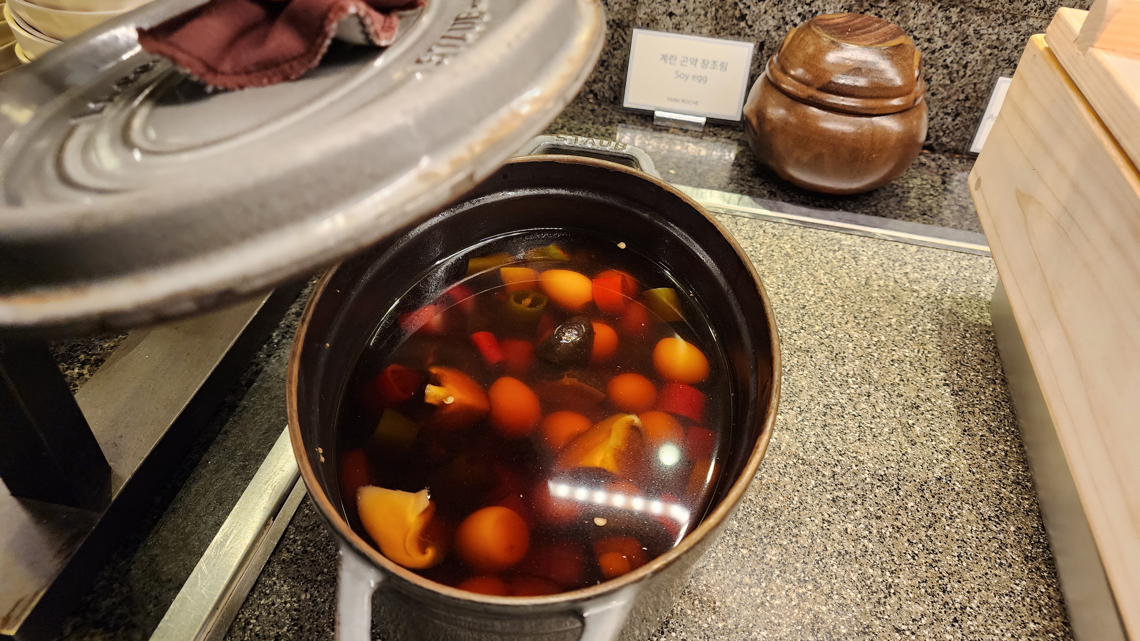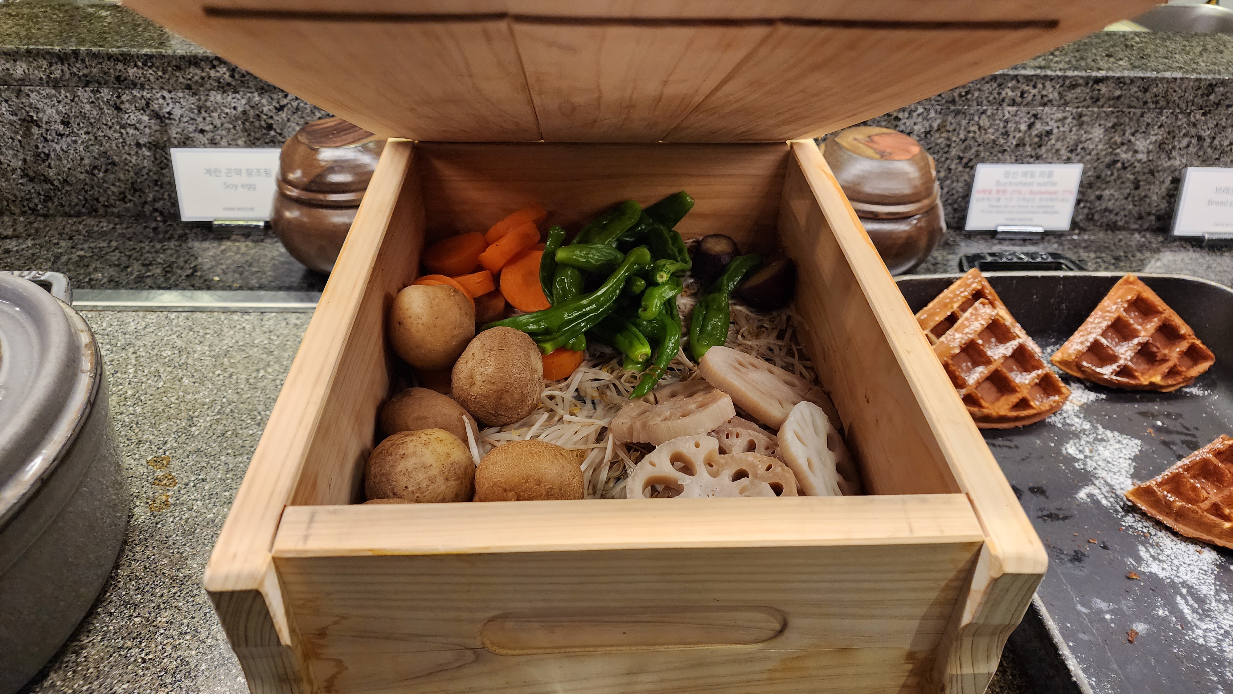 찜통에 연근 등이 있었고, 장조림, 와플 등이 있었는데 메이플 시럽 등도 옆에 있어서 기호에 맞게 먹을 수 있어 좋았어요.