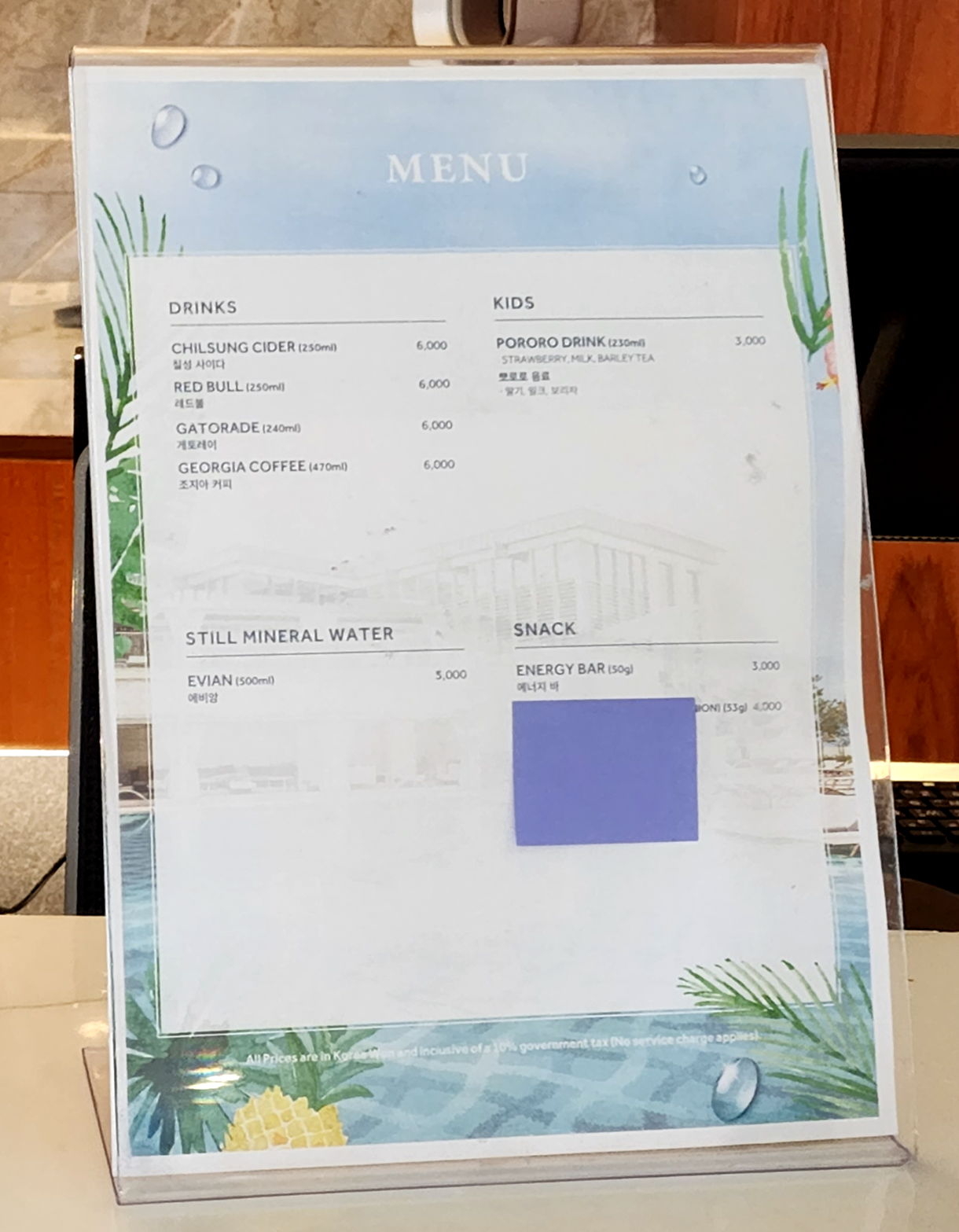뽀로로음료 3000원, 게토레이 6000원 등 호텔 수영장인 것을 감안한 가격이라고 생각해주시면 좋을 것 같아요.