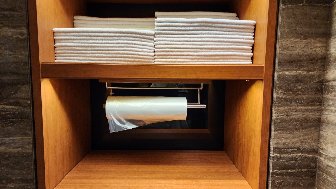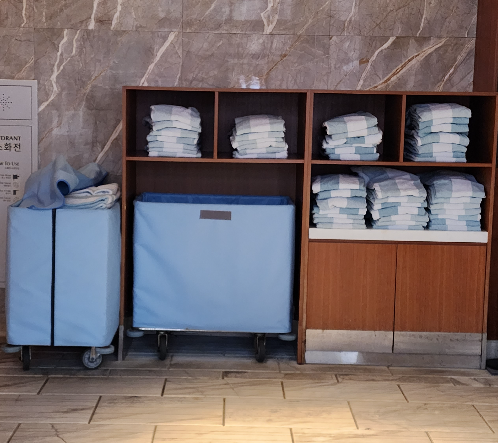 간단한 세면용품, 수건, 비닐 등이 비치되어있어서 이용에 불편함이 없더라구요.