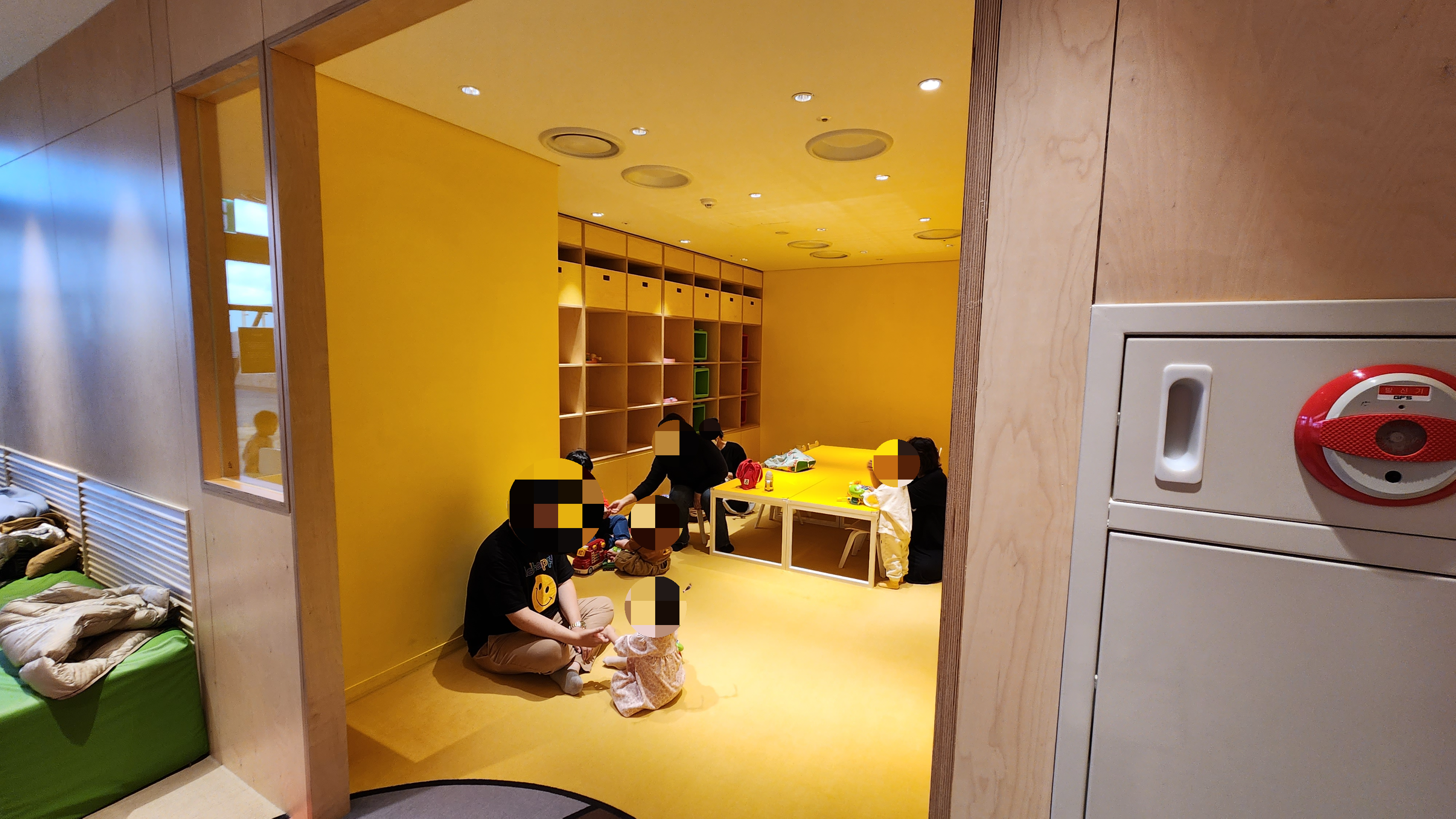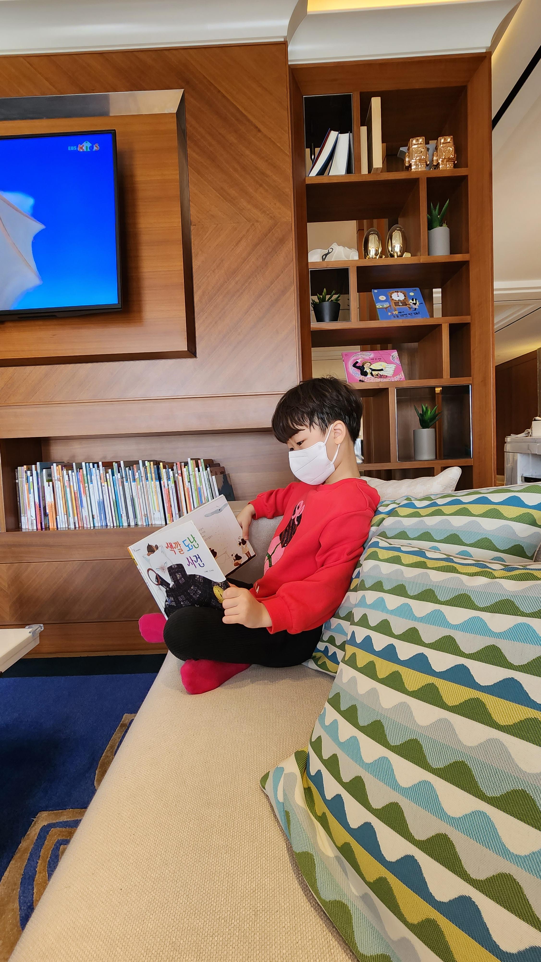 키즈존은 다음날 오픈런 했고요 체크아웃 하기 직전까지 놀다가 그림책 도서관 입장 후 동글아빠는 체크아웃 하러 보냈었어요.