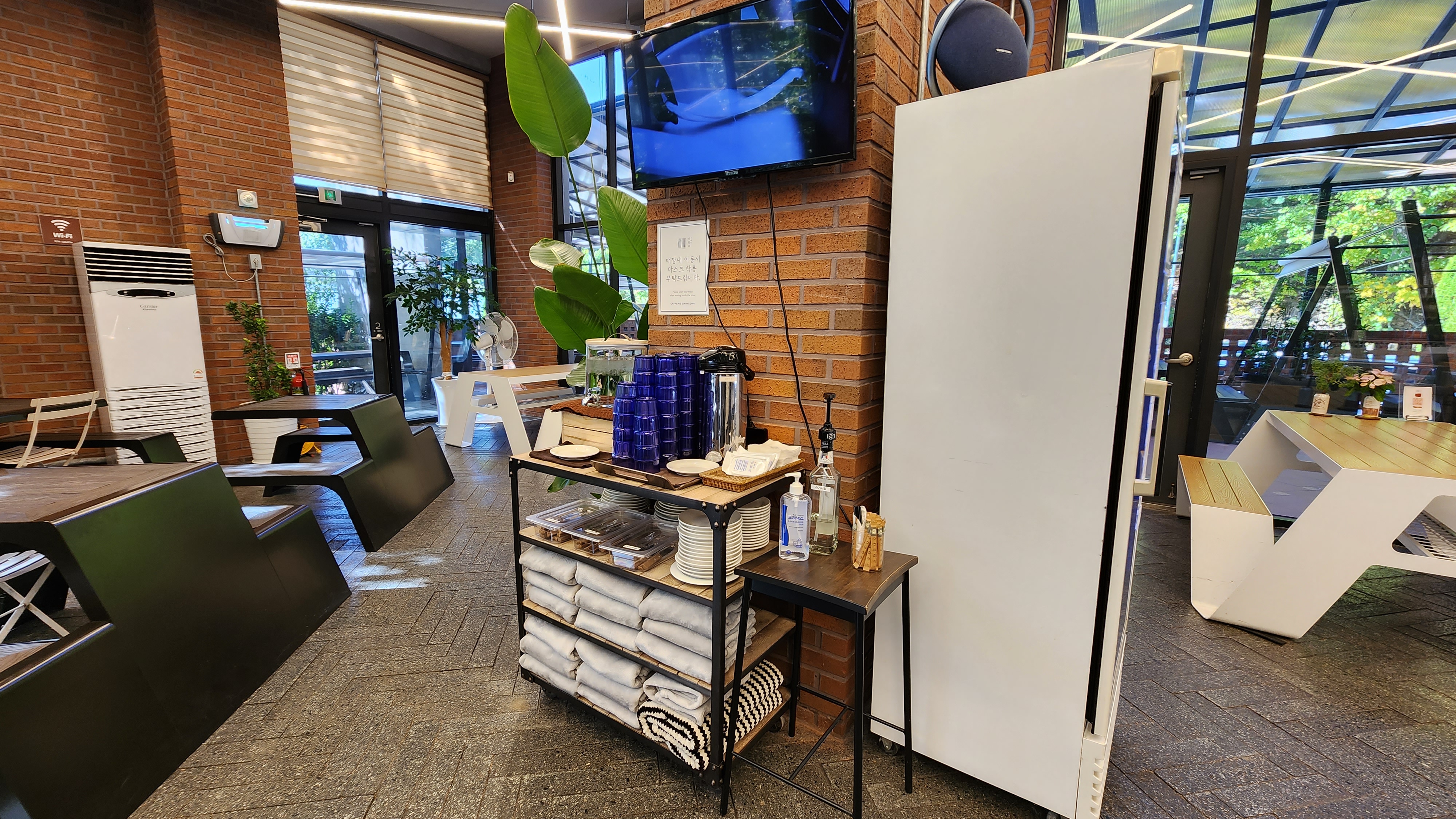담요, 물, 컵, 식기 등이 놓여있는 셀프바가 있어서 필요한 식기들은 챙기시면 되어요.