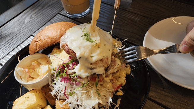 이 푸짐한 자태의 음식은 뉘른베르크 버거번인데요 빵도 맛있고, 치즈, 패티, 소스다 잘 어우러졌어요.