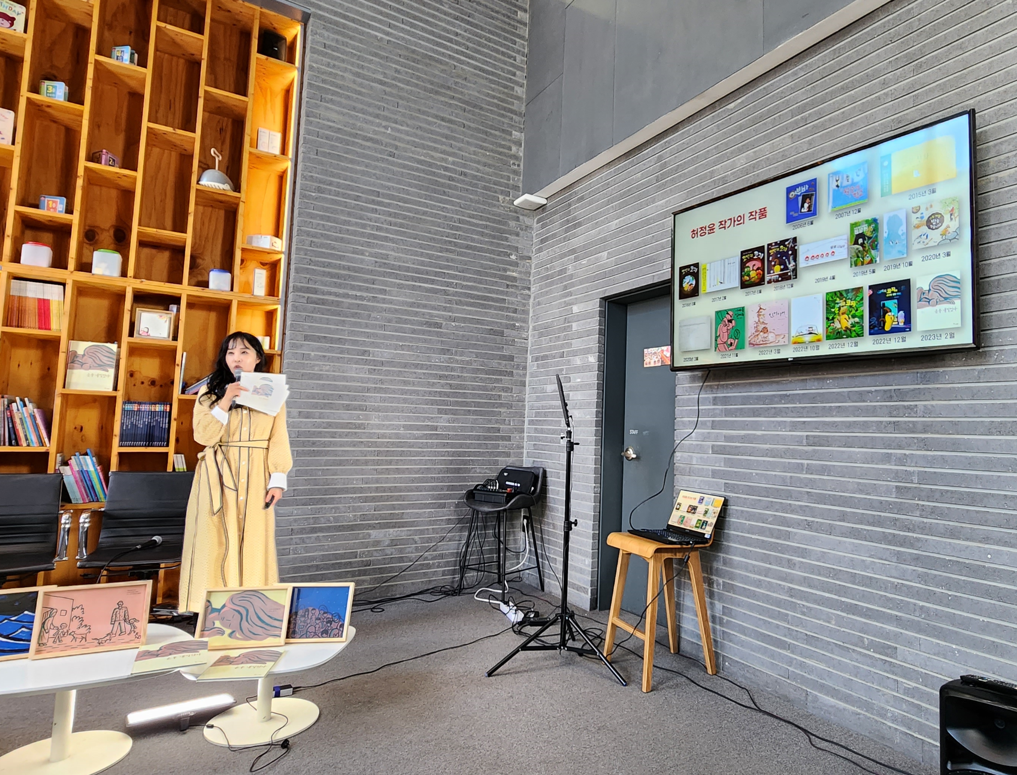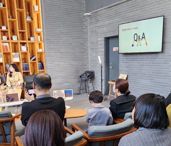 이 사진은 지난 2023년 2월 25일에 있었던 <손을 내밀었다> 출간파티에서 있었던 허정윤 작가님 북토크의 한 장면이예요.