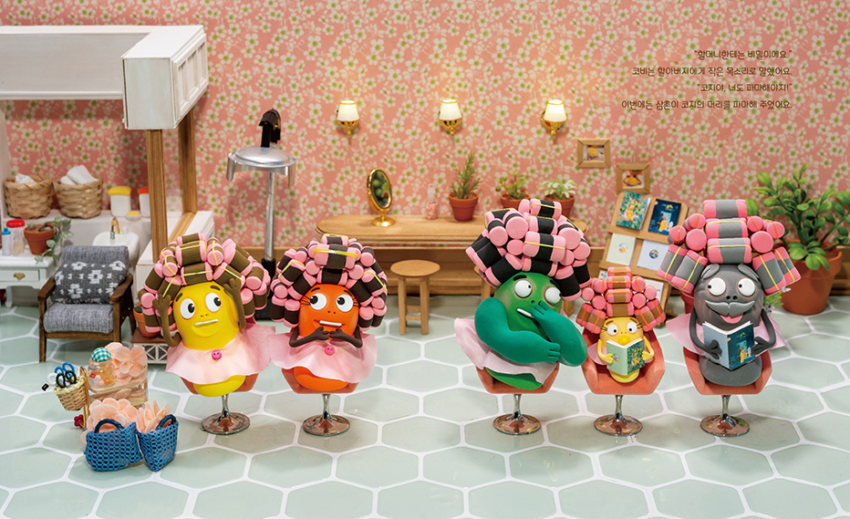 파마하는 코딱지들 뒤로 전면책장이 있는데요 작가님의 다른 코딱지 코지 그림책들이 깨알같이 표지로 보여서 반가웠답니다.
