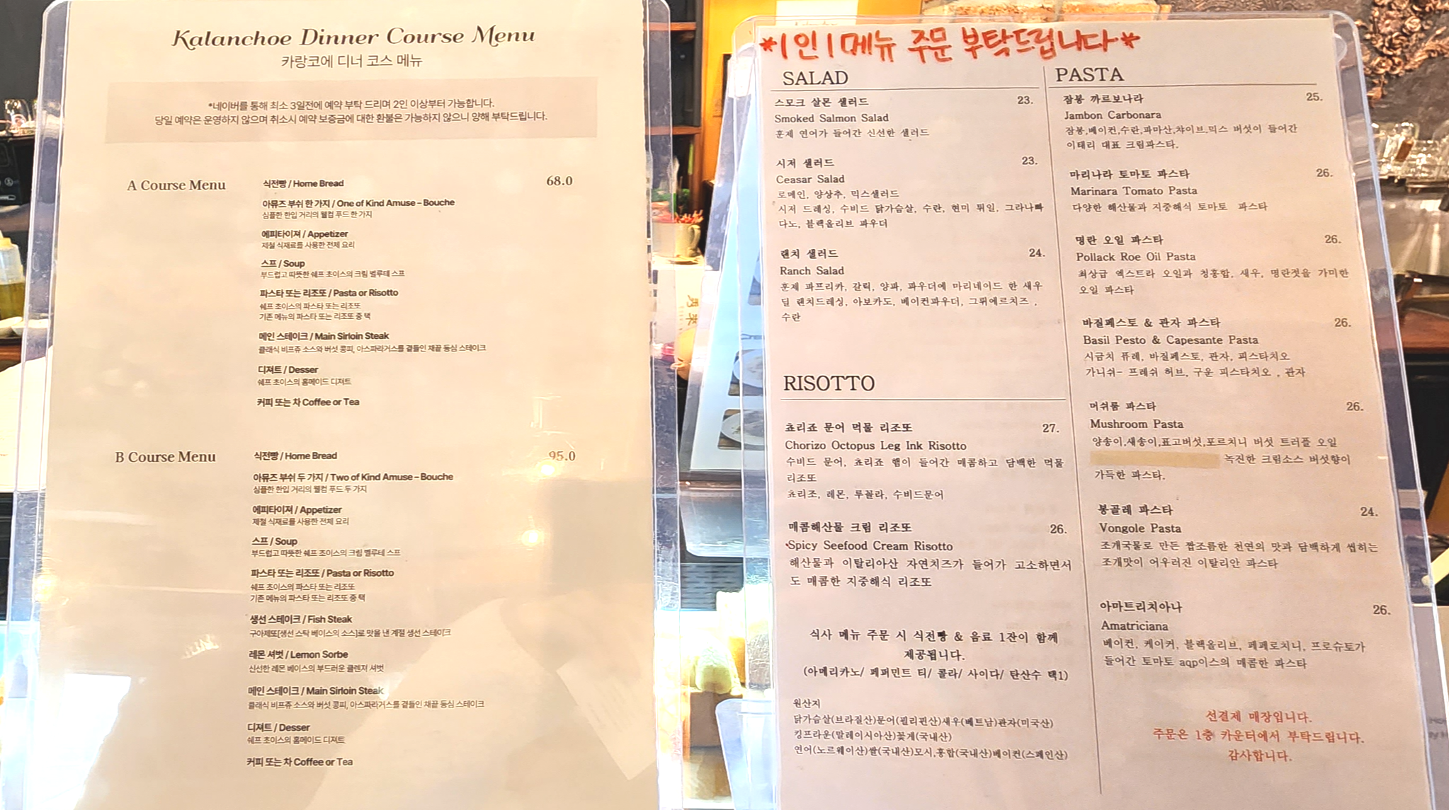 디너 코스메뉴는 네이버 통해 최소 3일전 예약 해야 하고 당일예약은 운영하지 않는다고 하네요.