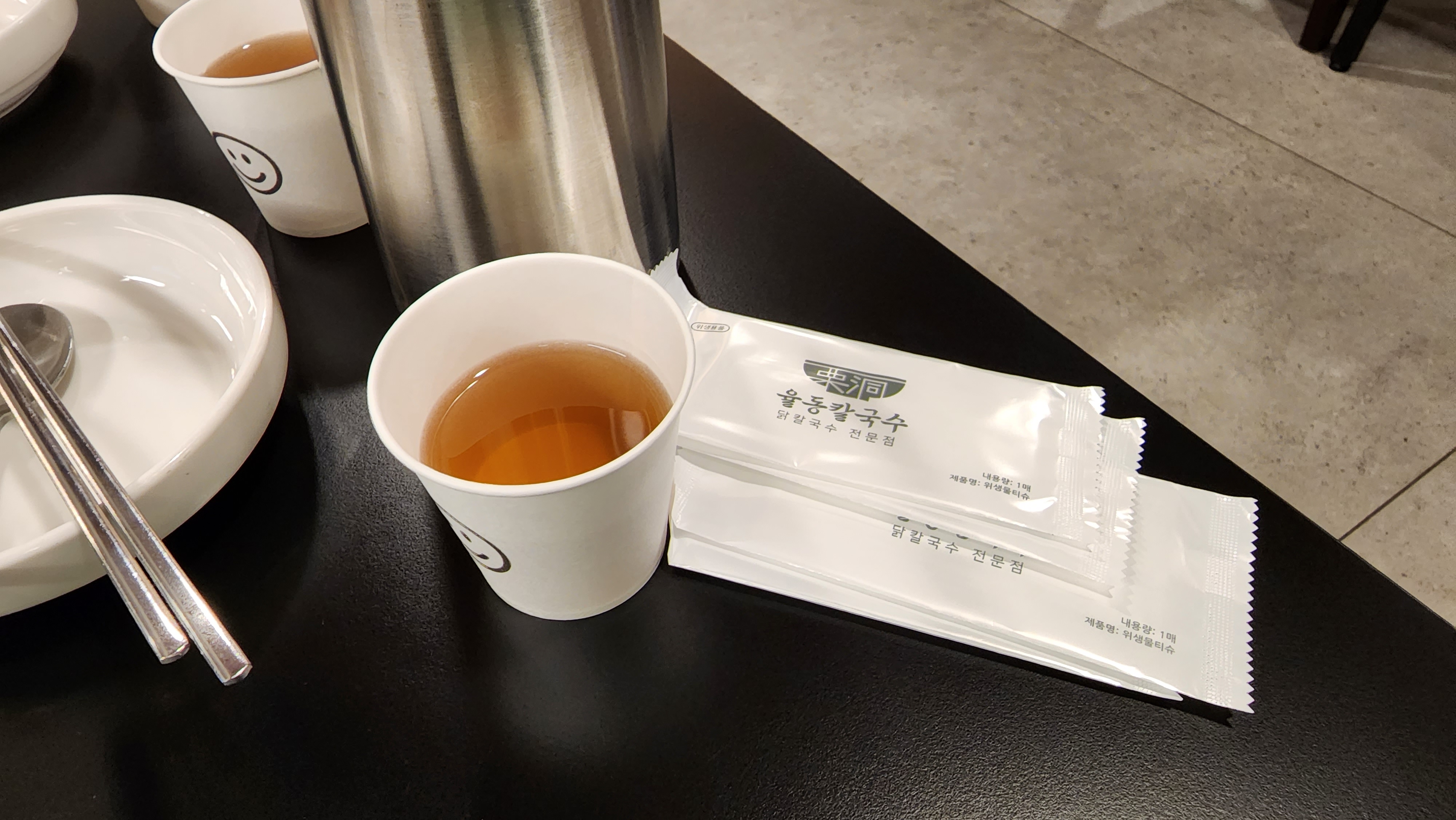 물은 보리차(?)였던 듯 하고 서랍에 식기와 냅킨 있고, 물티슈도 가져다 주셨어요.