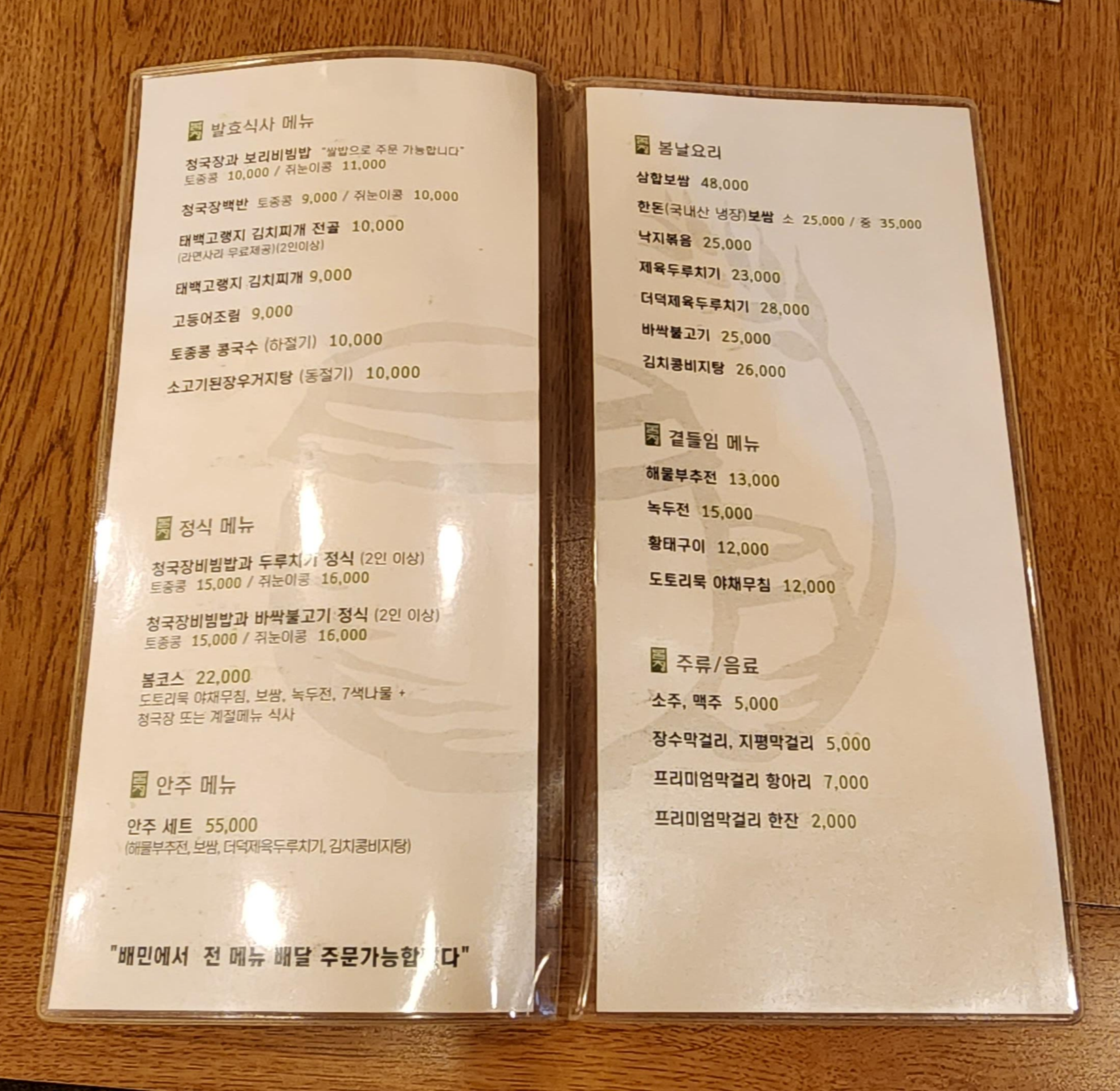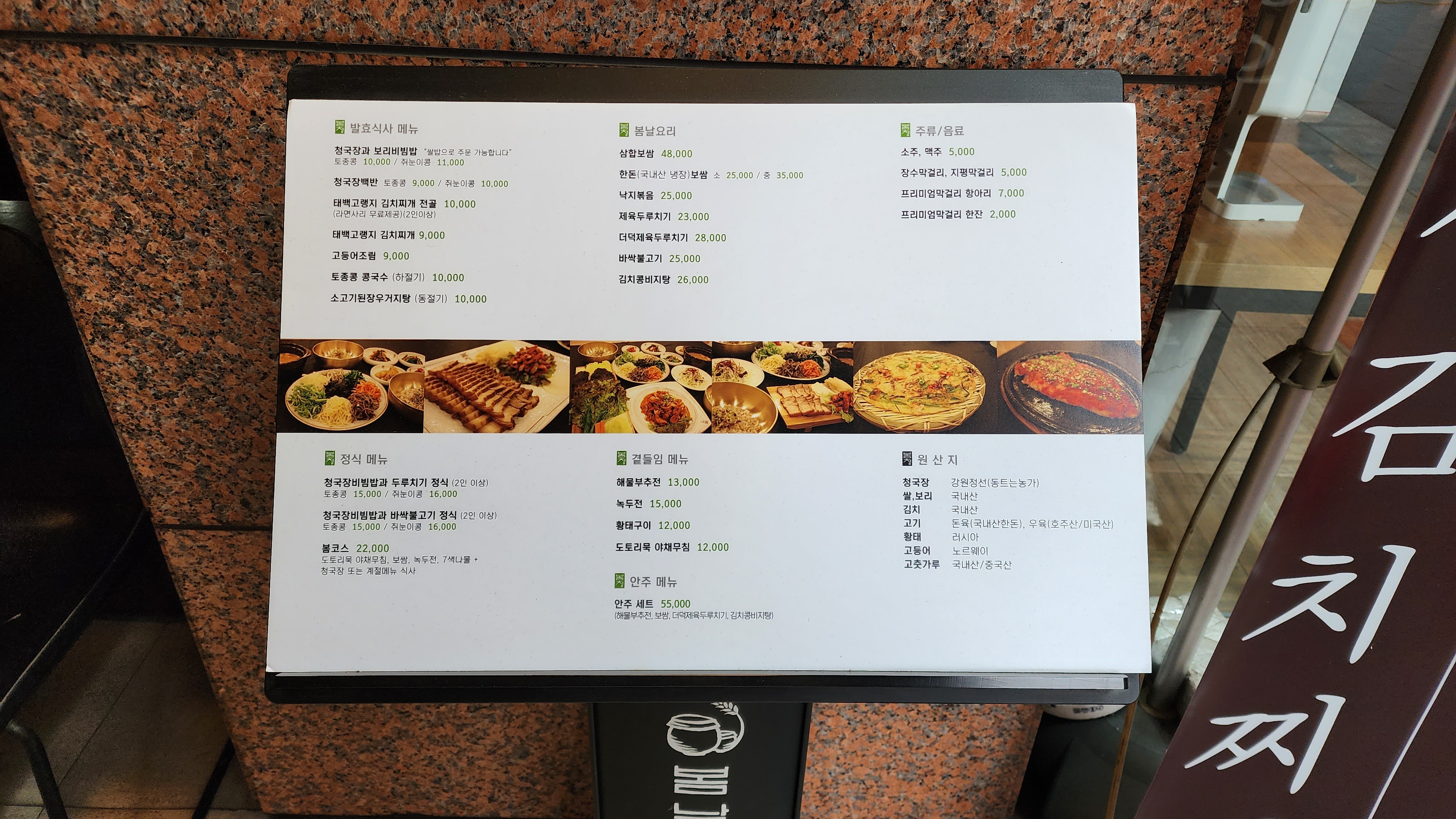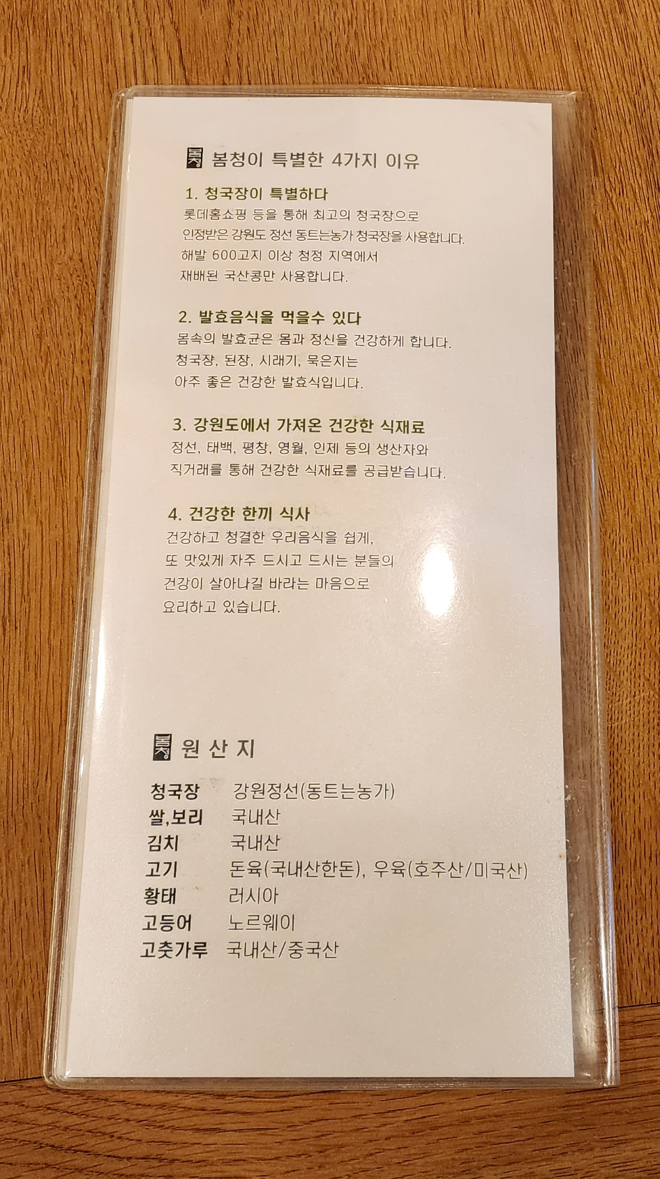 테이블에 착석하면 요런 메뉴판을 주시는데요 깔끔하게 나와있고 원산지도 표기되어있었어요.
