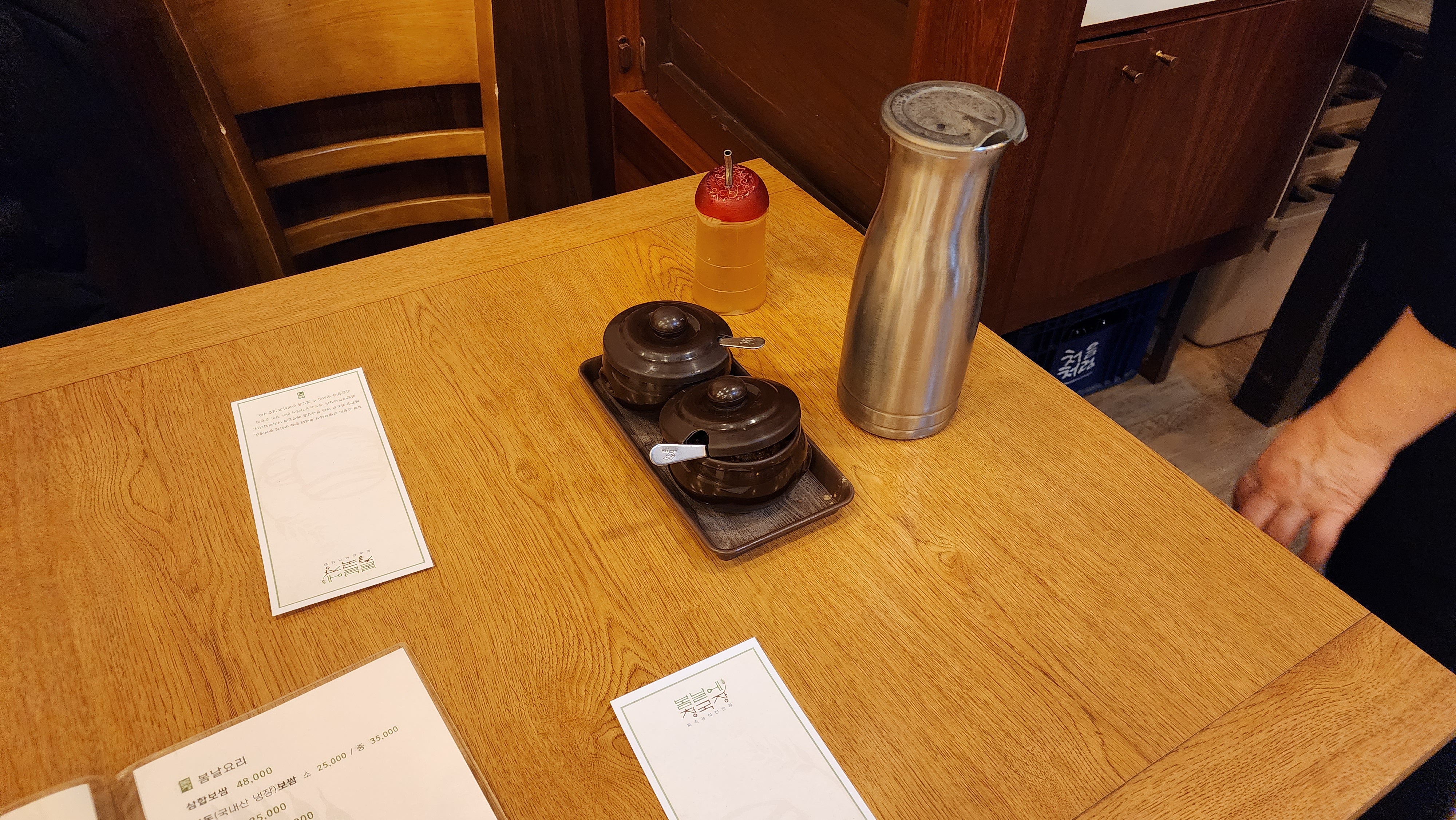 자리에 고추장, 강된장, 참기름, 물병 휴대용버너 셋팅해주셨고 서랍엔 냅킨과 식기가 들어있었어요.
