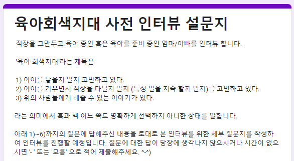 작가님과 만나서 인터뷰를 하기 전에 사전 인터뷰 설문지를 링크로 받았어요.
