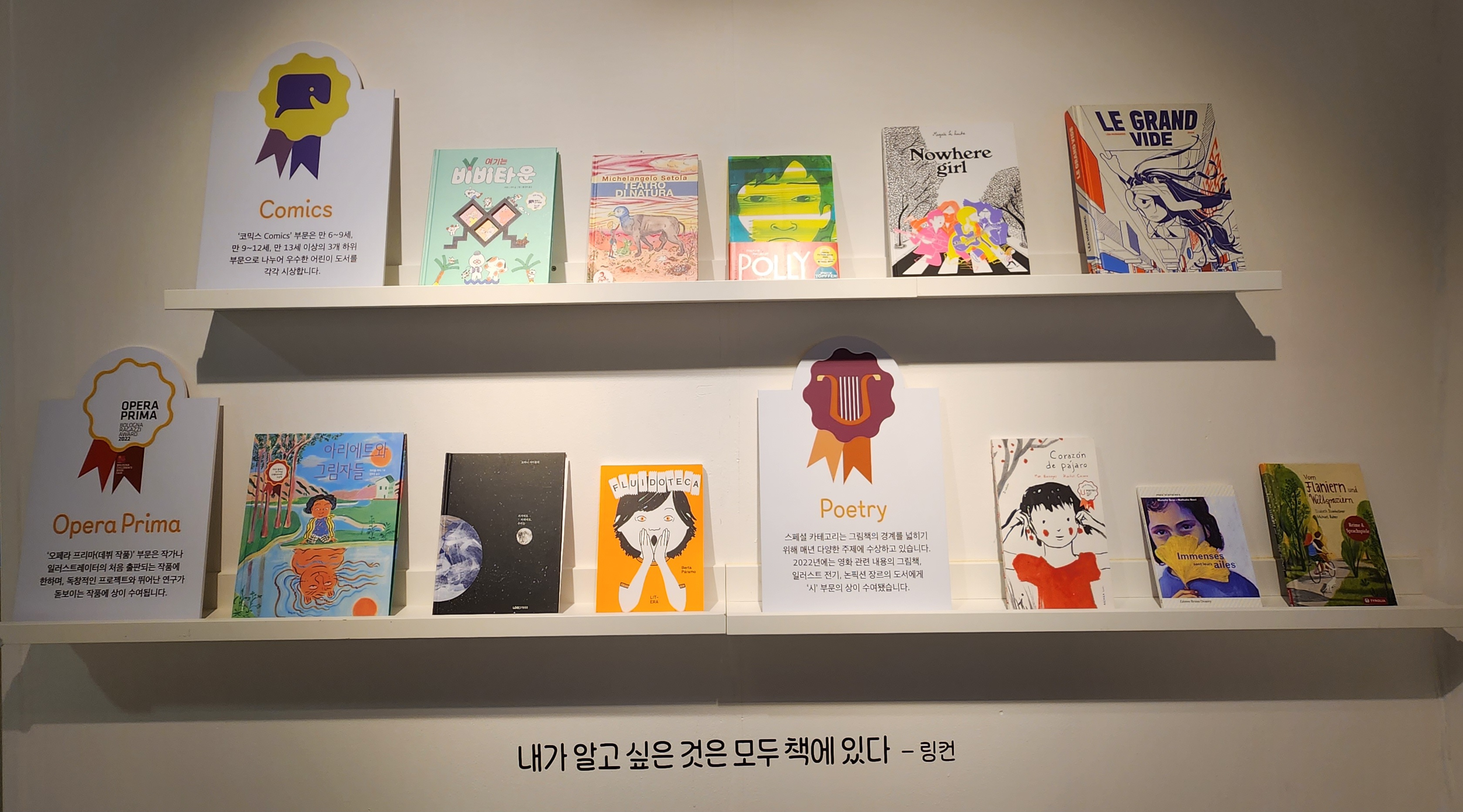 볼로냐 라가치상 에 관련된 섹션인데요 어떤 상이 있는지 그동안 어떤 수상작이 있는지 보실 수 있어요.
