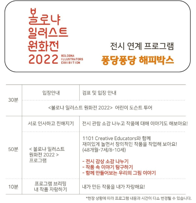 !!! 볼로냐 일러스트 원화전 x 1101 창의에꼴 !!! 공식 전시체험프로그램 48개월-7세 <퐁당퐁당 해피박스> 1101 Creative Educators와 함께 전시투어를 재미있게 즐기고 작품에 대해 대화하고 영감을 받아