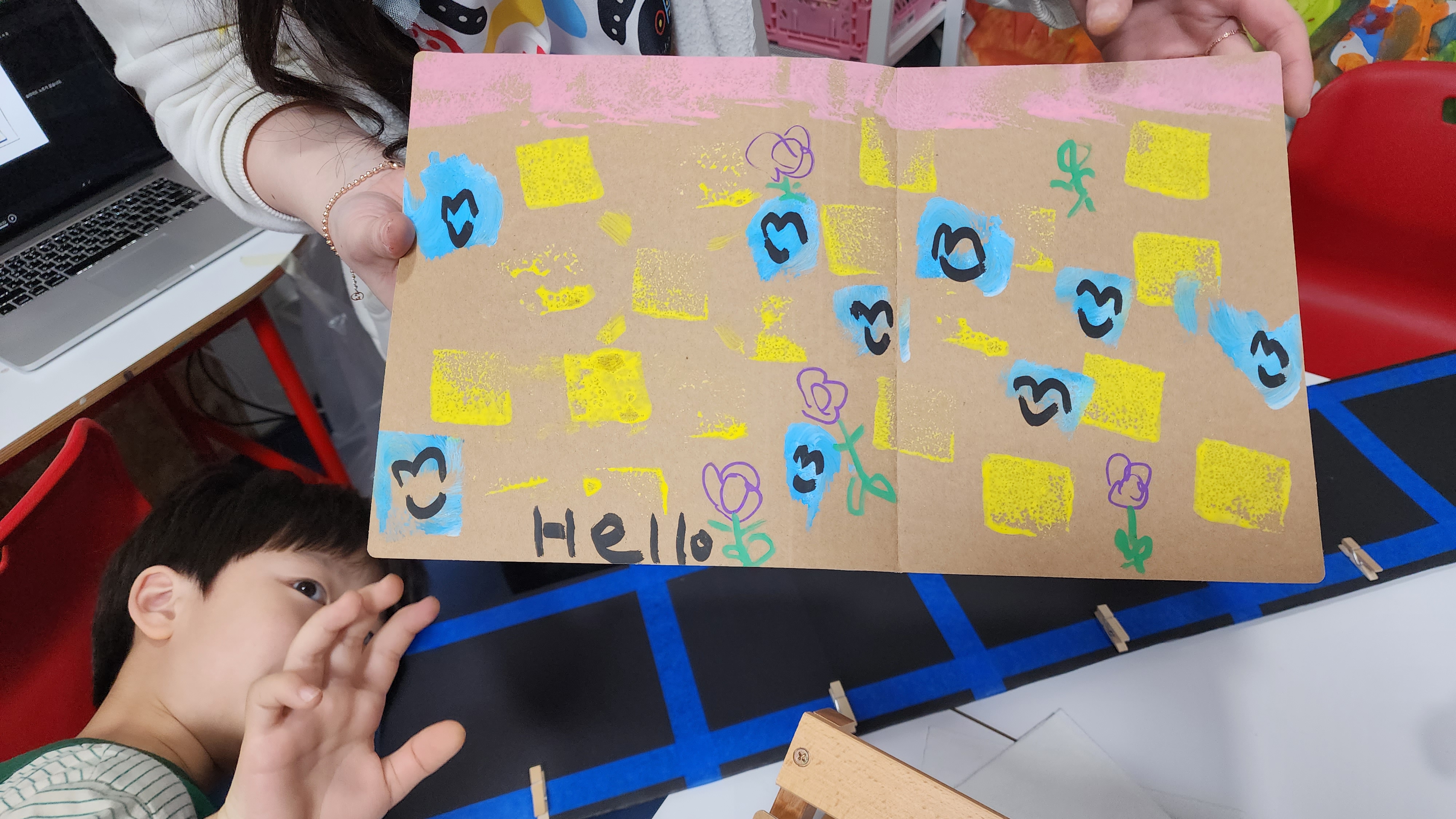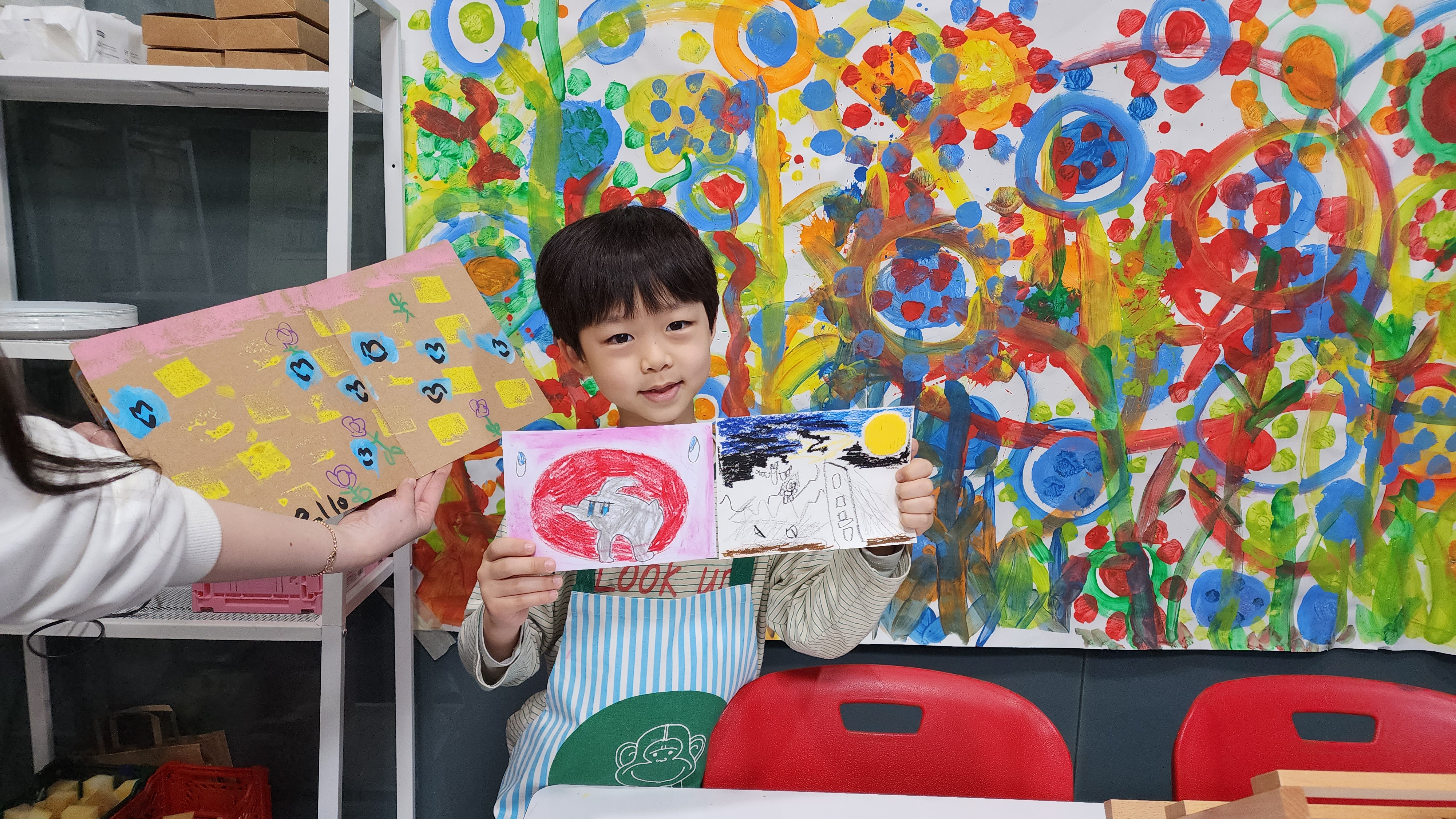 본인이 어떤 그림을 그렸는지 열심히 설명하는 동글이가 참 대견했어요.