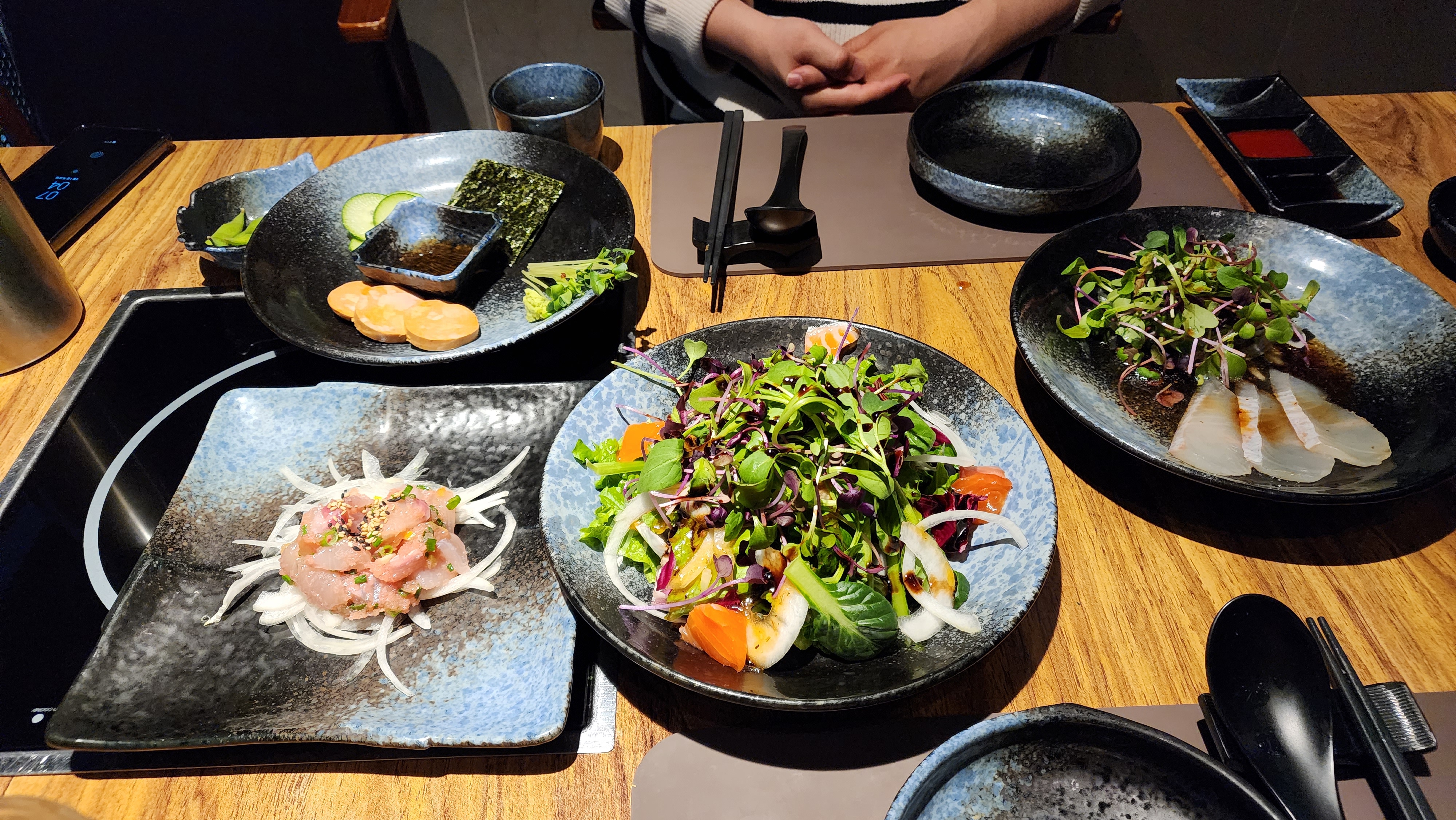무침회, 연어샐러드, 숙성회가 나왔어요.