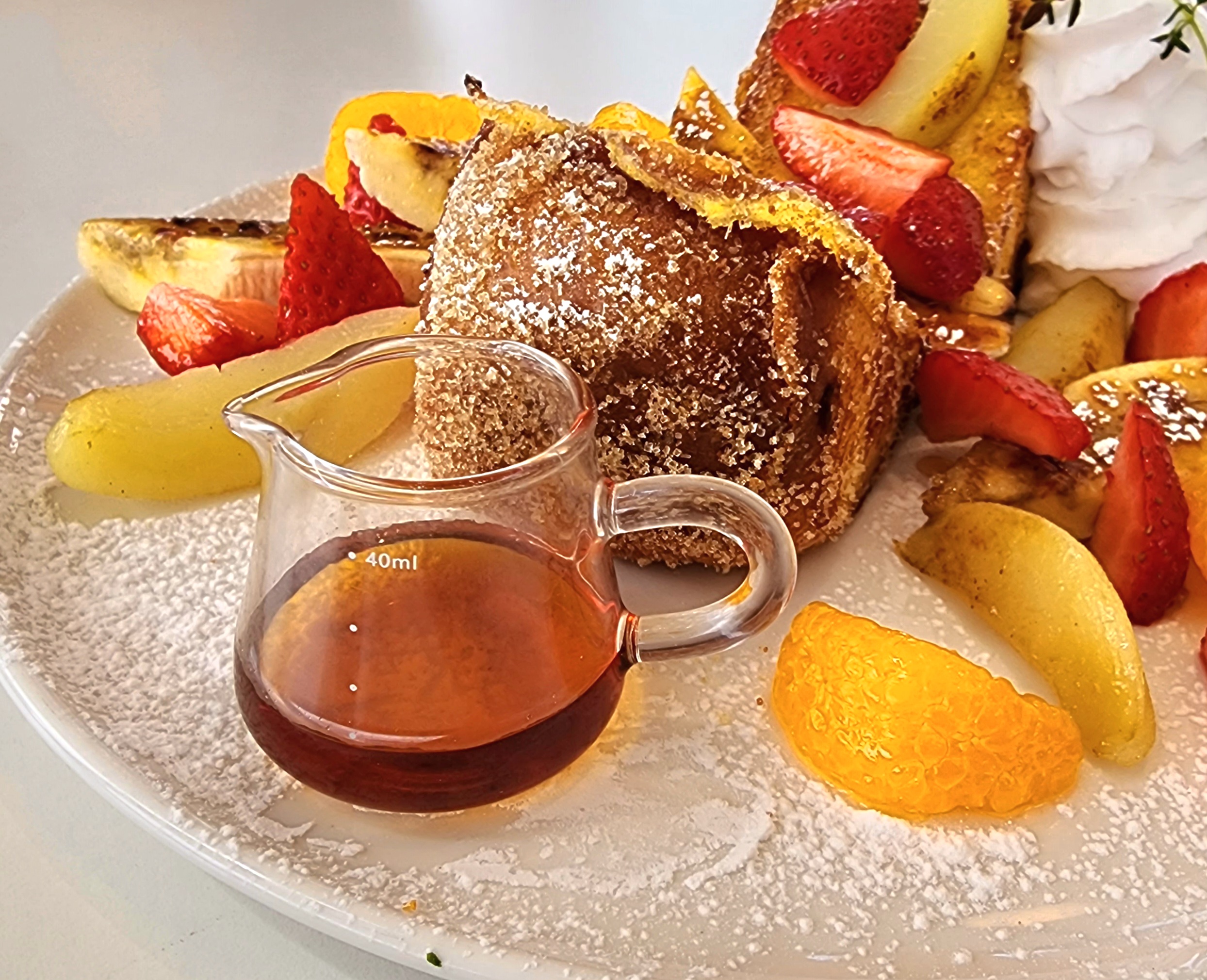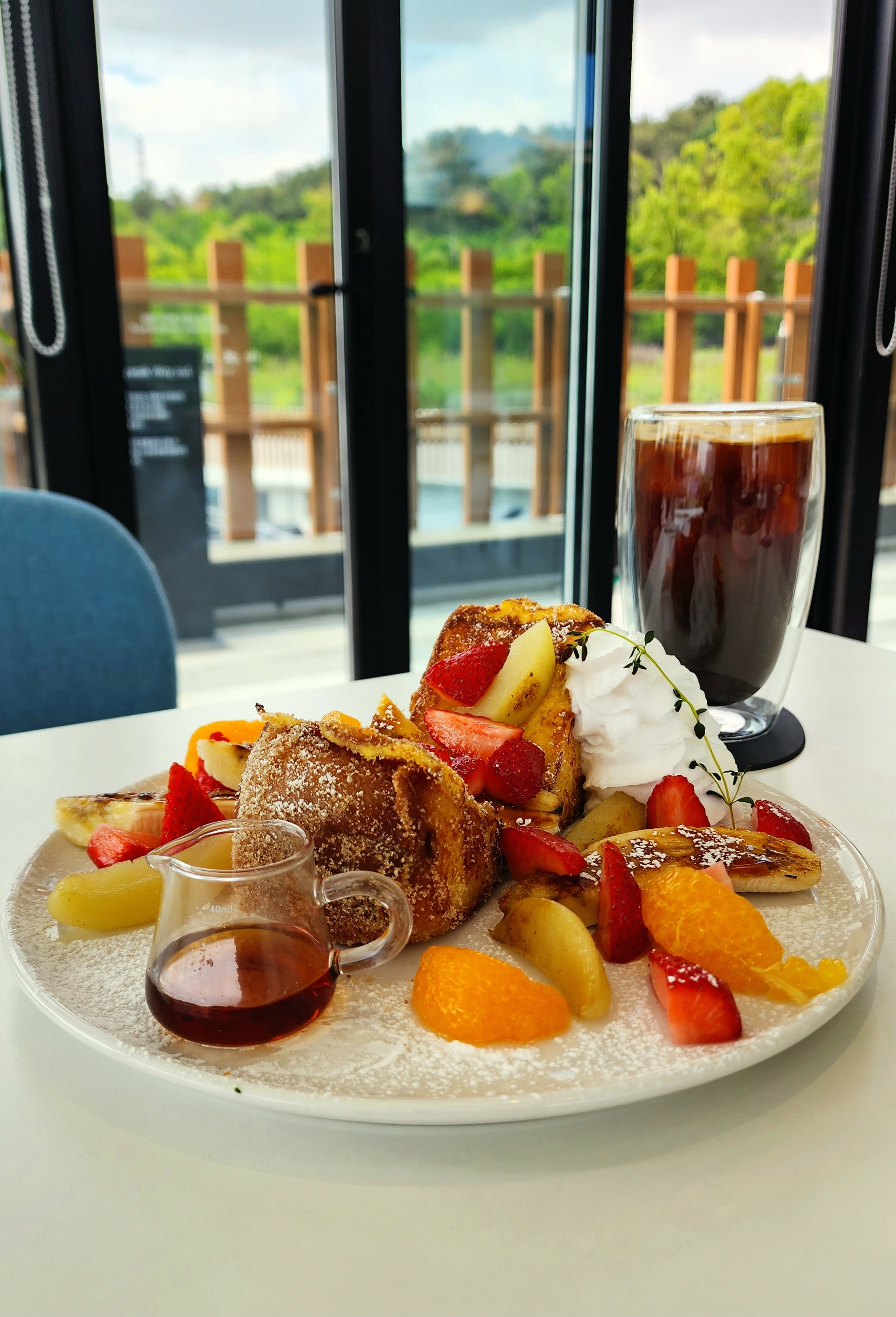 메이플시럽도 귀엽게 따로 담겨 나왔고 휘핑크림에 과일 찍어먹으면 커피랑 완죤 쿵짝이 잘 맞는 맛이 나요.