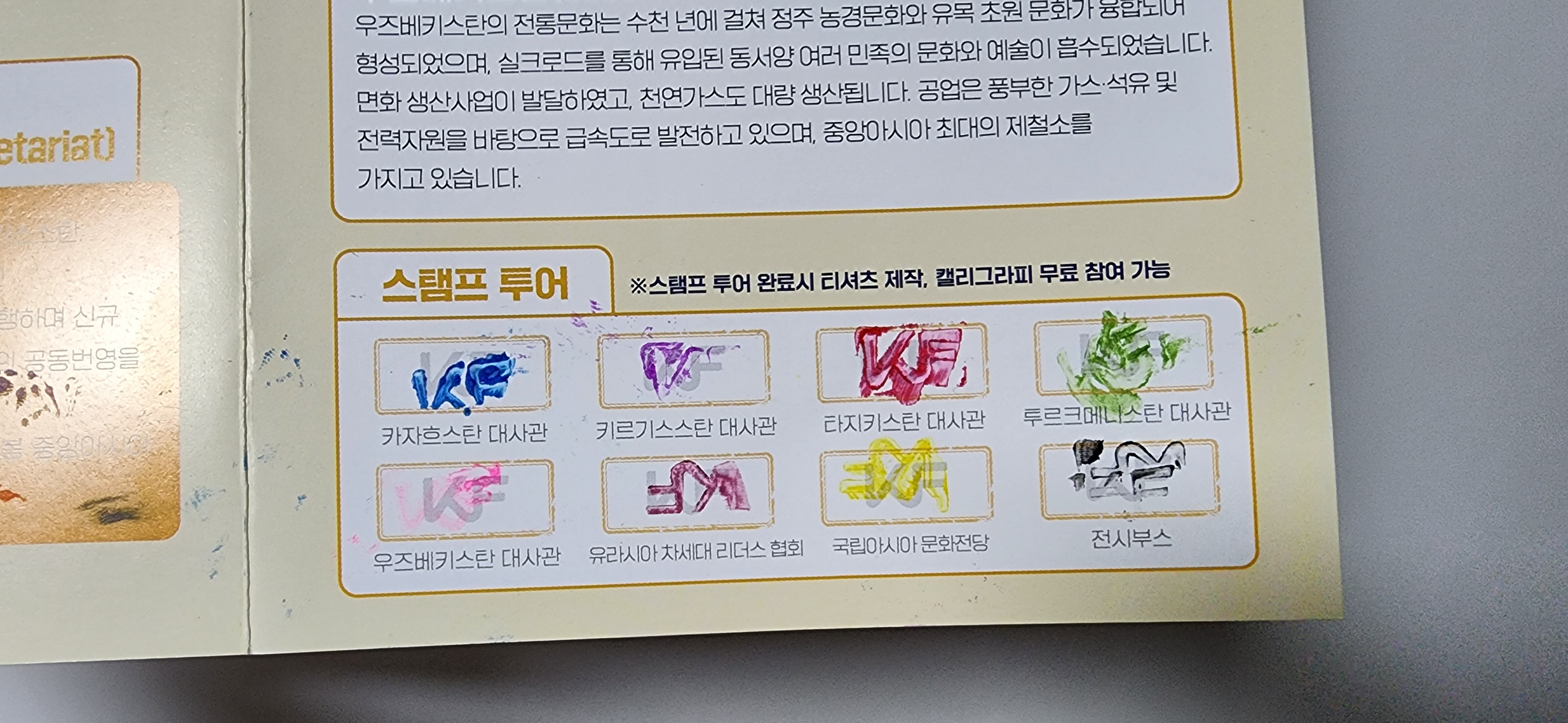 각국 대사관 부스에서 스탬프를 찍으면 투어 완료시 티셔츠 제작 및 캘리그라피 무료 참여가 가능했어요.