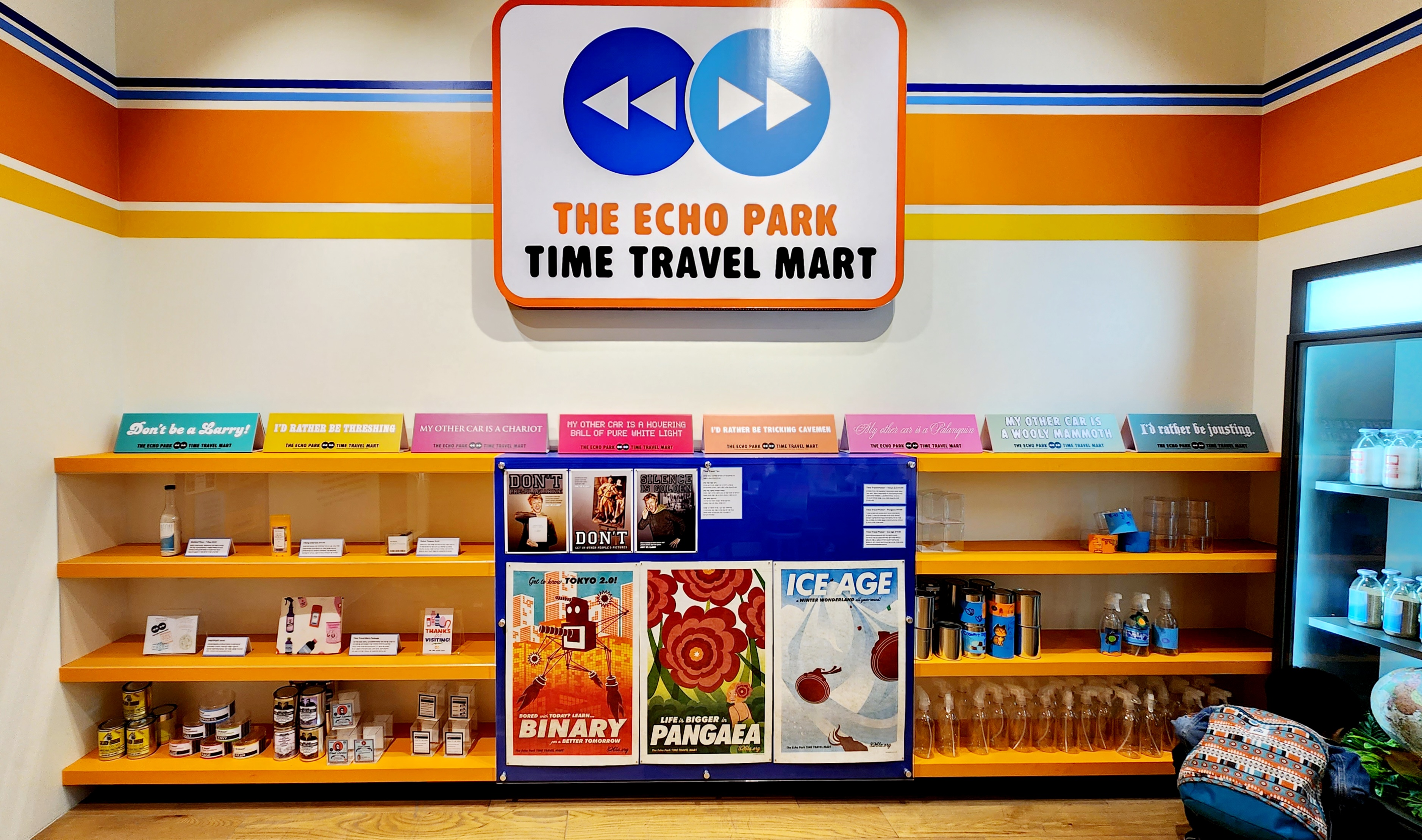 맥 바넷은 로스앤젤레스에 시간 여행자를 위한 물건을 판매하는 '에코 파크 타임 트래블 마트'를 열었다고 하는데요,