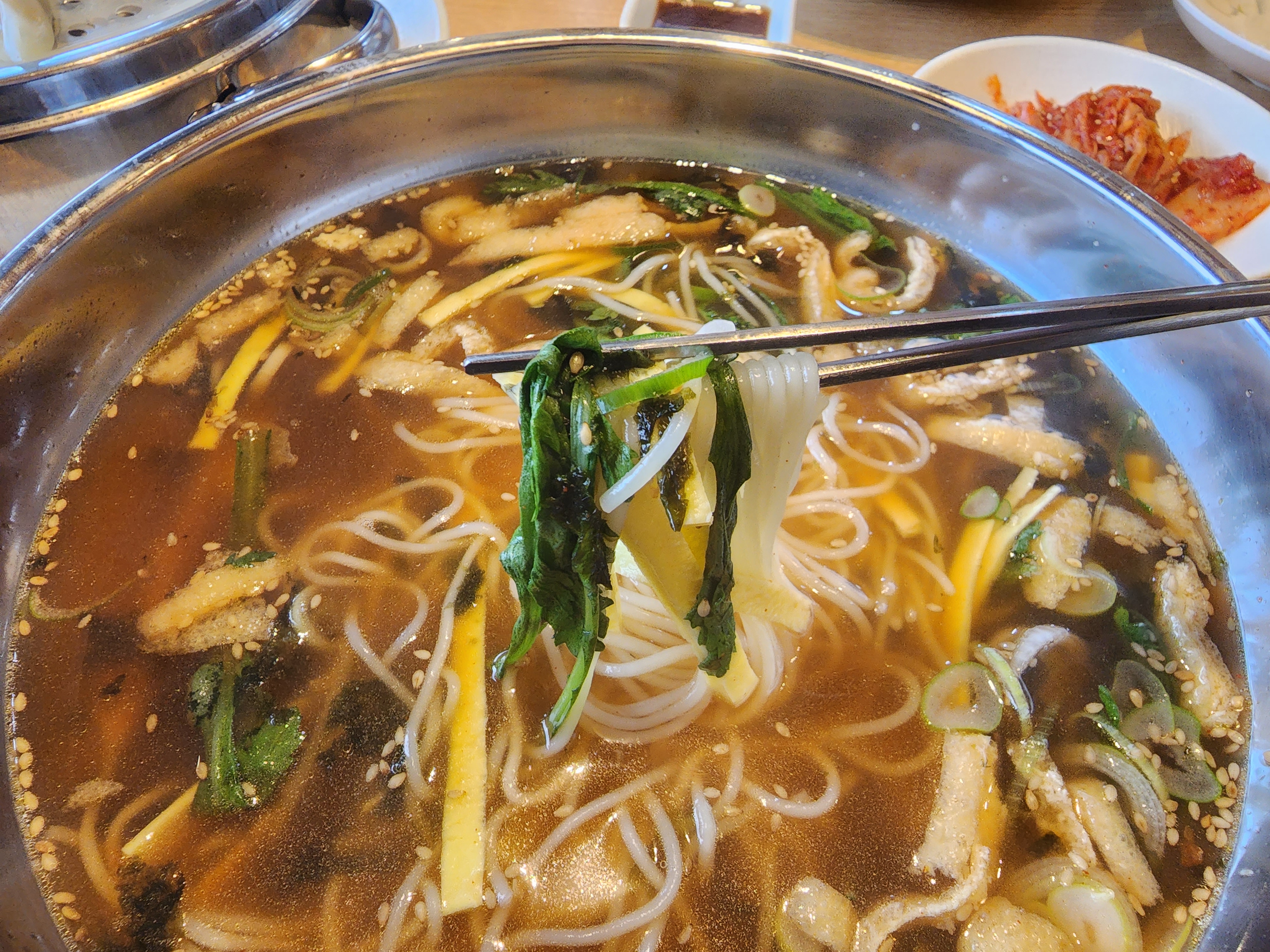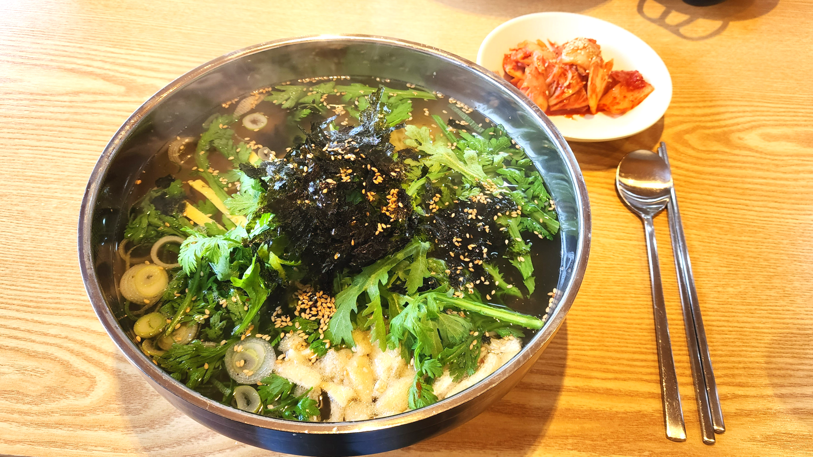 쑥갓, 유부, 계란고명, 김고명 등이 올려져 있는데 빨간 양념이 안에 들어있어서 혹시나 아이와 방문하시는 분들은 양념장 고려하고 주문 하셔야 할 것 같아요.