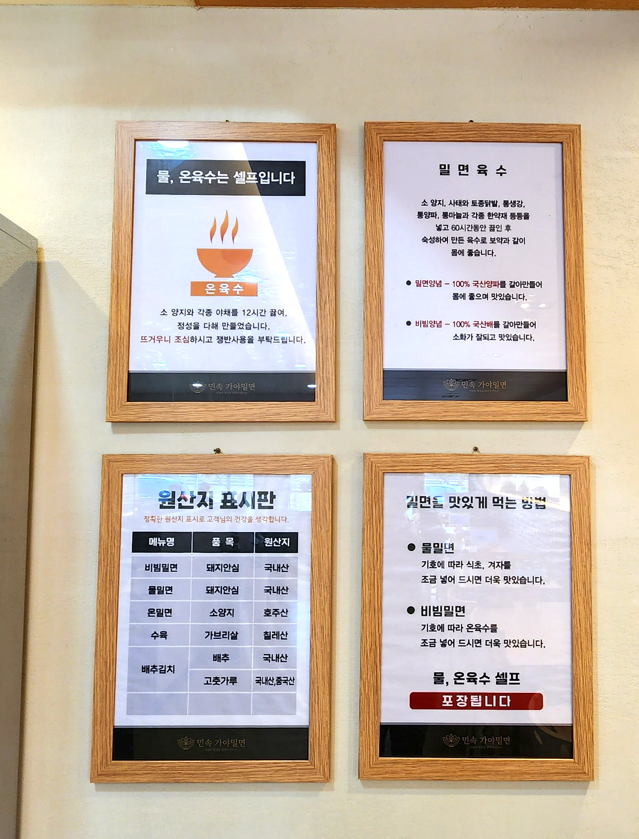 이집 원산지 표시판을 보면 비빔밀면, 물밀면 돼지안심 국내산 이었고