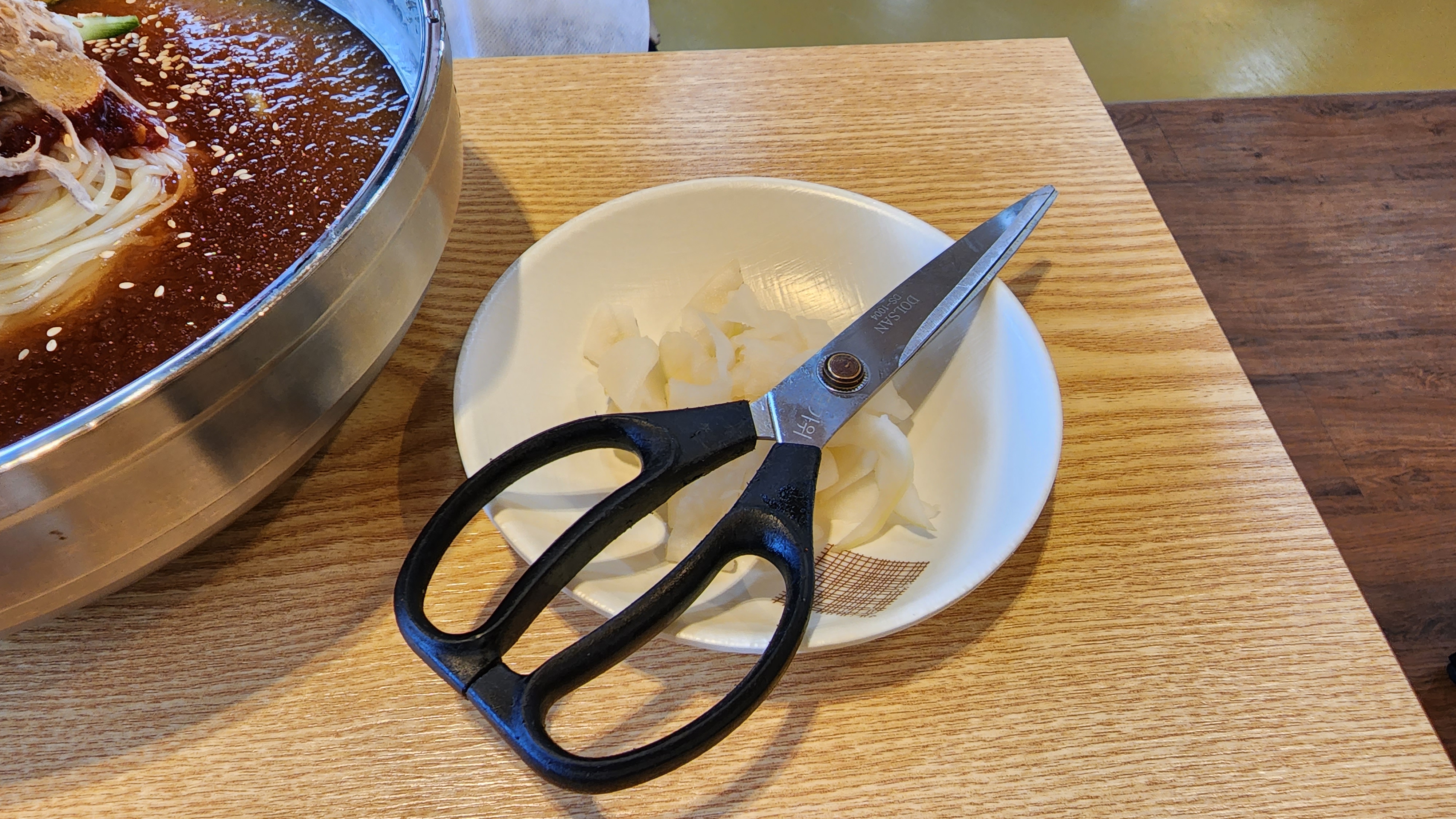 동글아빠는 가위로 면을 많이 잘라서 먹는 편이예요.
