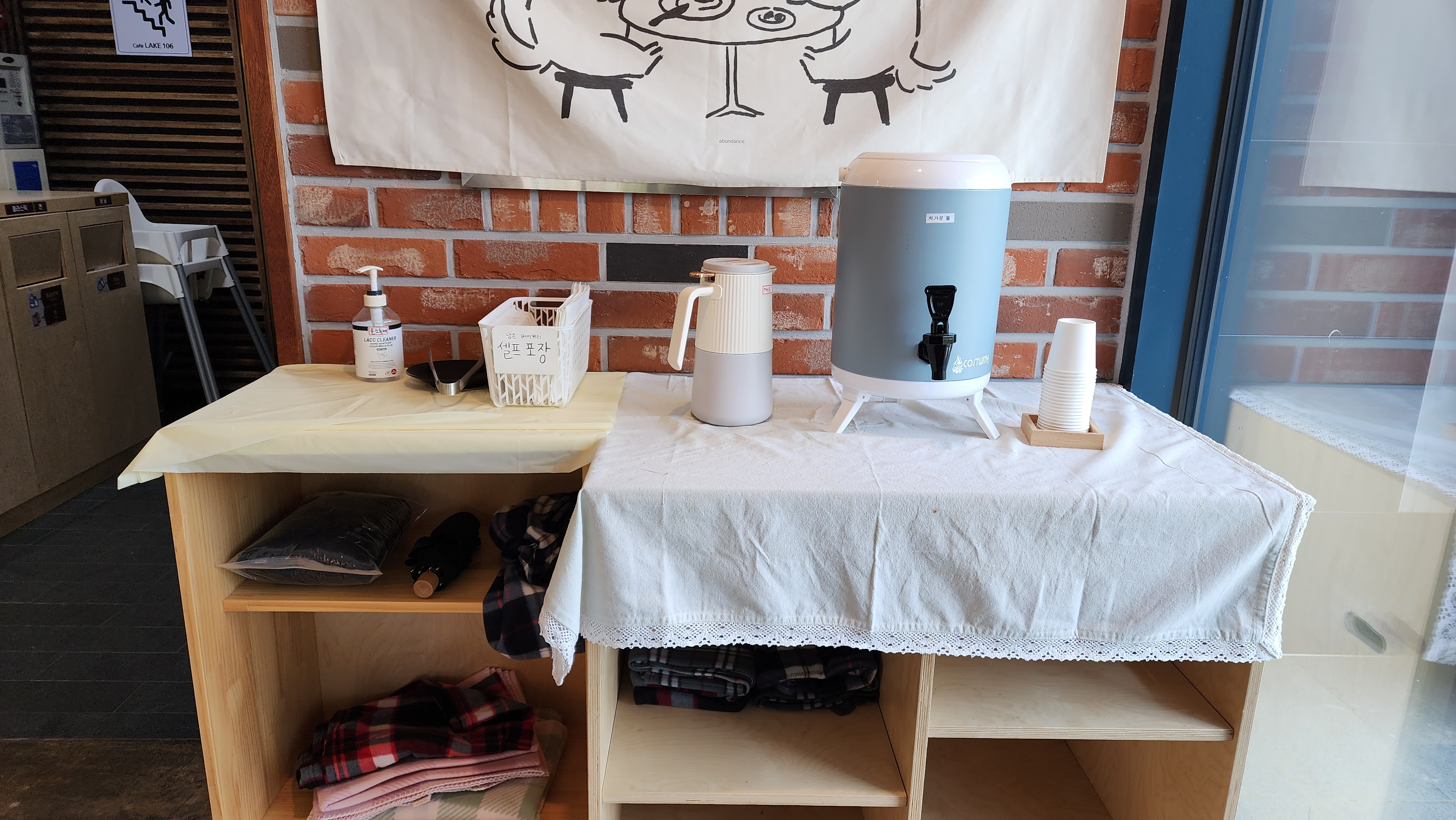 1층 내부에도 테이블이 꽤 있었고 서비스코너에 테라스에서 이용할 수 있도록 담요도 있었어요.