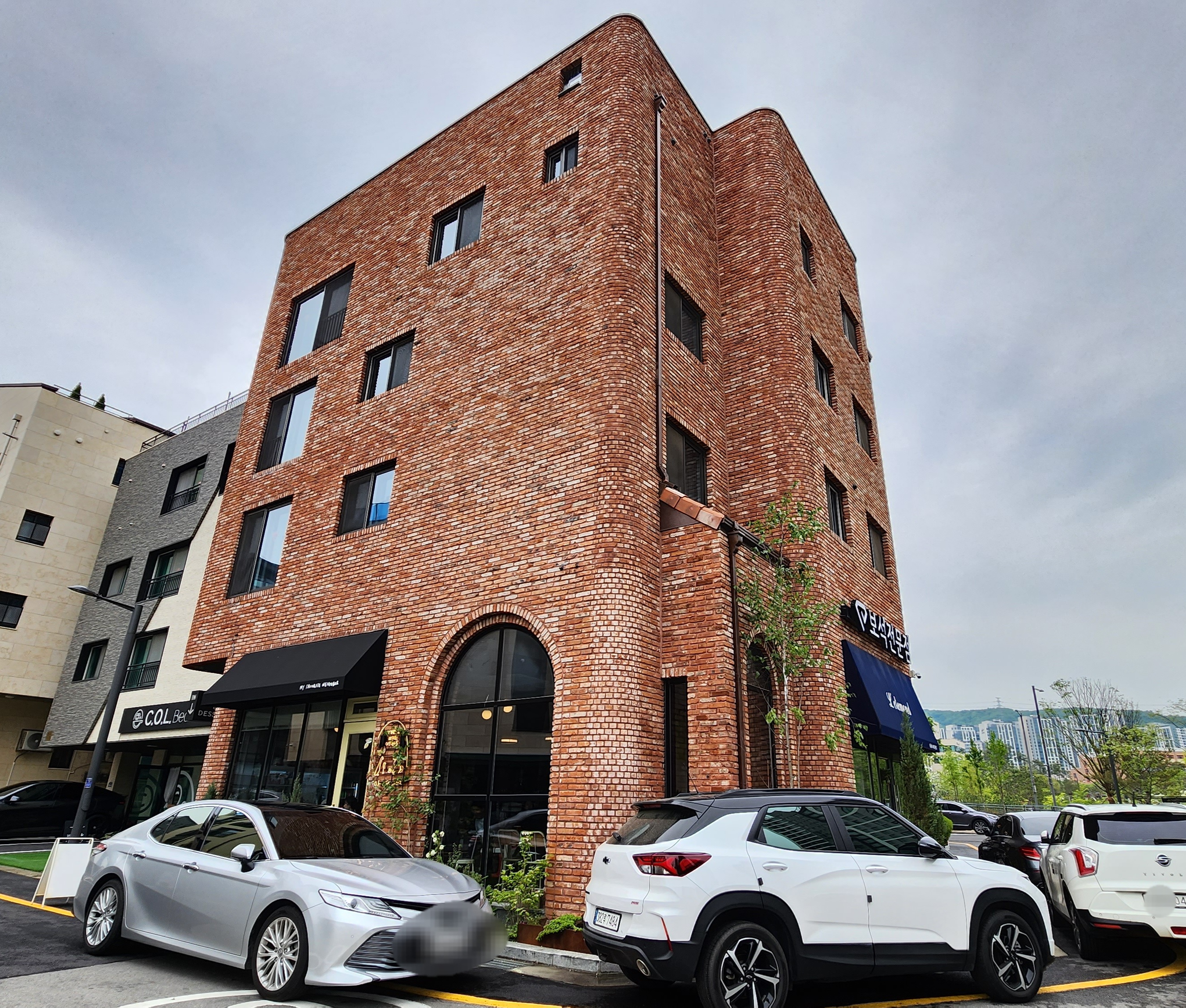 빨간 벽돌건물에 깔끔한 외관을 가지고 있어요.