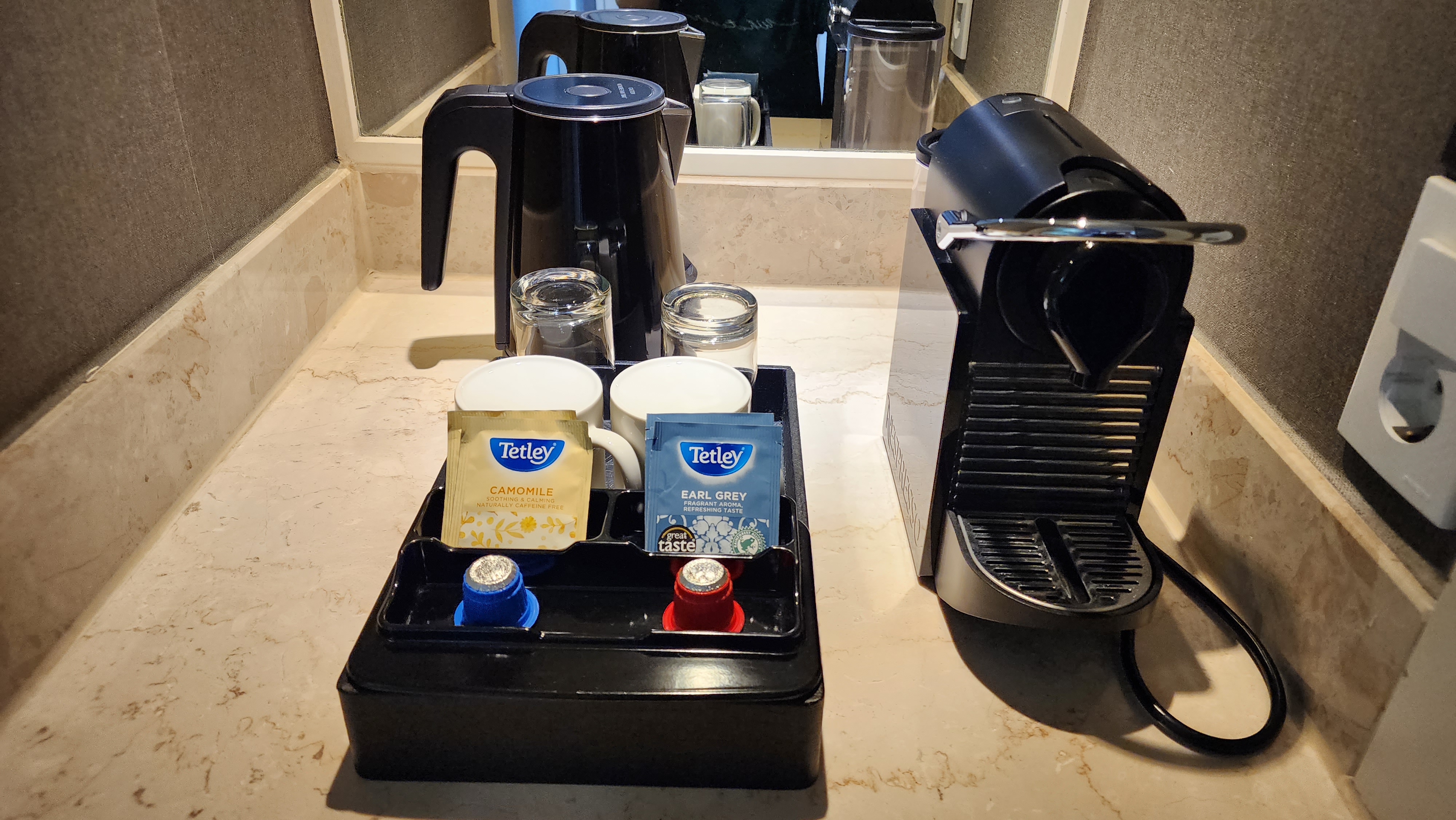 캡슐커피 2개, 티, 생수3병이 비치되어있었어요.