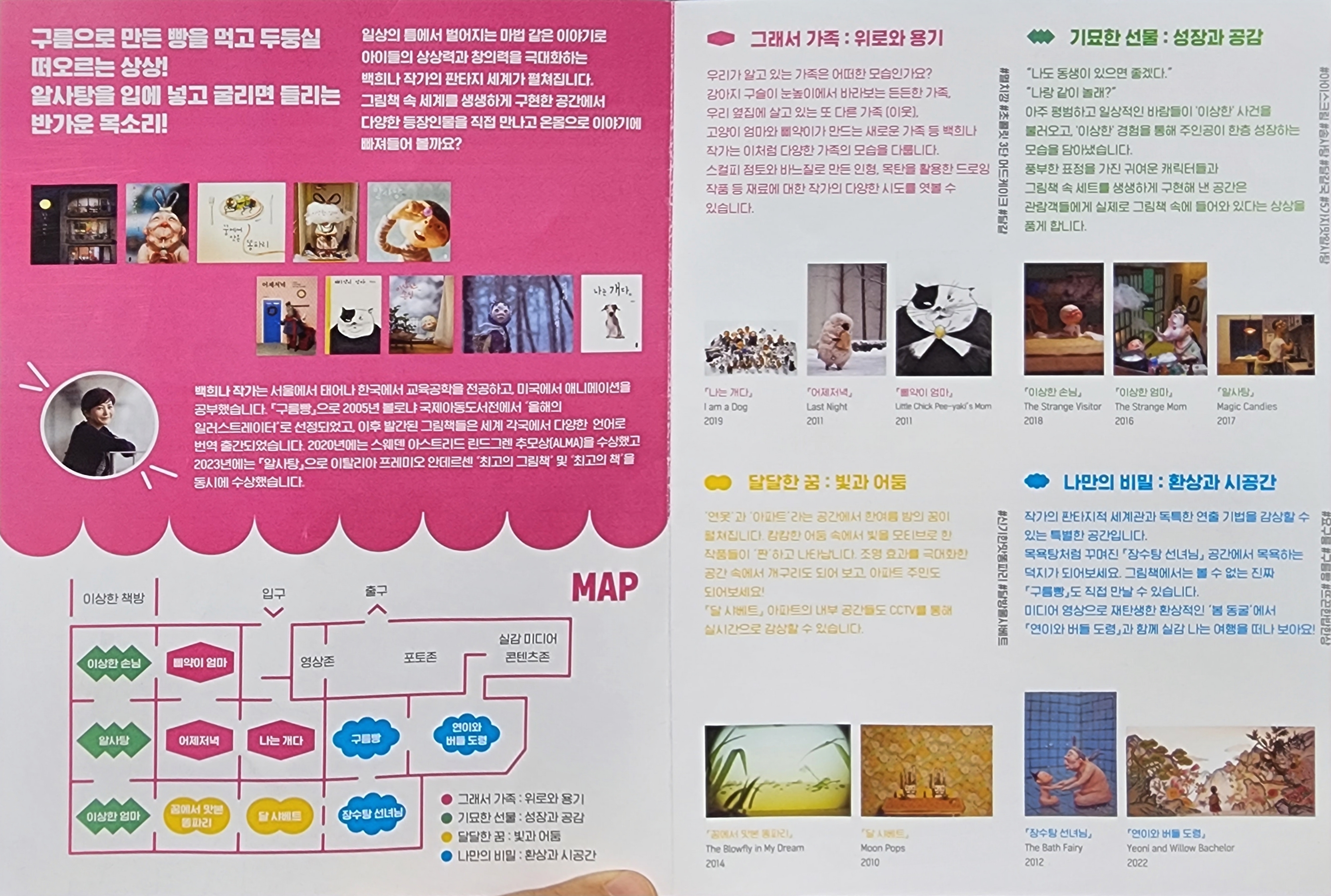 <이상한손님>, < 삐약이엄마>, <알사탕>, <이상한엄마>, <꿈에서 맛본 똥파리>, <나는개다>, <달샤베트>, <구름빵>, <장수탕선녀님>, <연이와버들도령> 작품들을 그래서가족, 기묘한선물, 달달한 꿈, 나만의 비밀 이렇게 네가지 카테고리로 묶어 전시 해두었더군요.