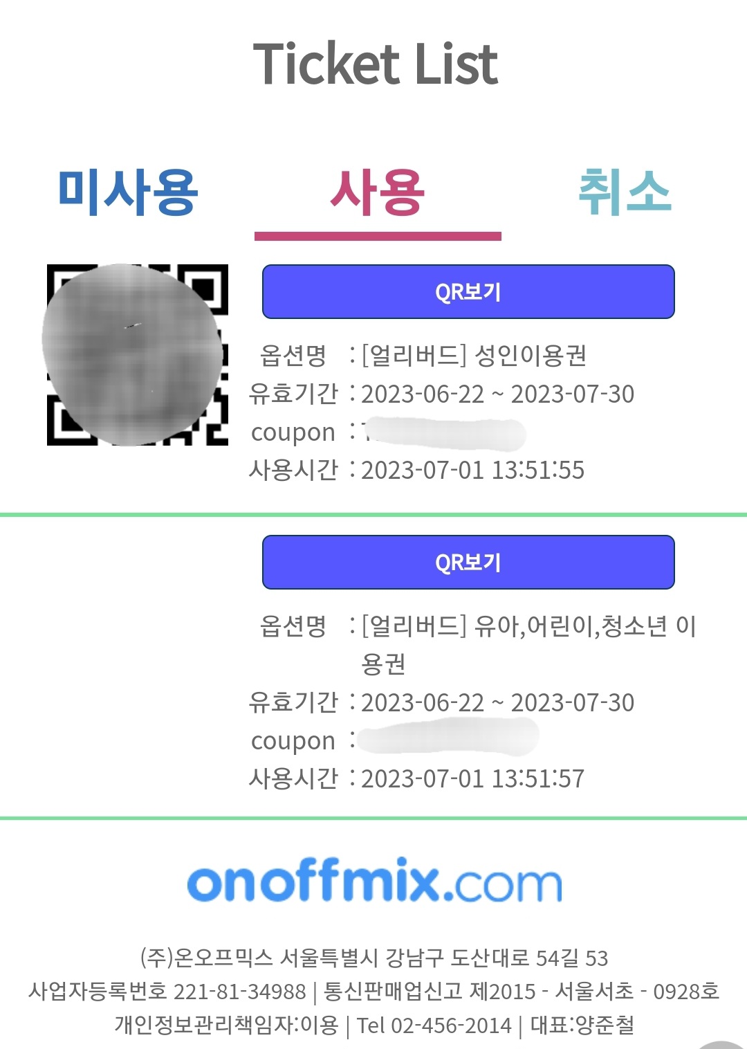 모바일 이용권 링크를 누르면 티켓 리스트가 나오는데 저는 사용후에 캡쳐했고요 사용전 티켓은 미사용 탭에서 확인 가능해요.