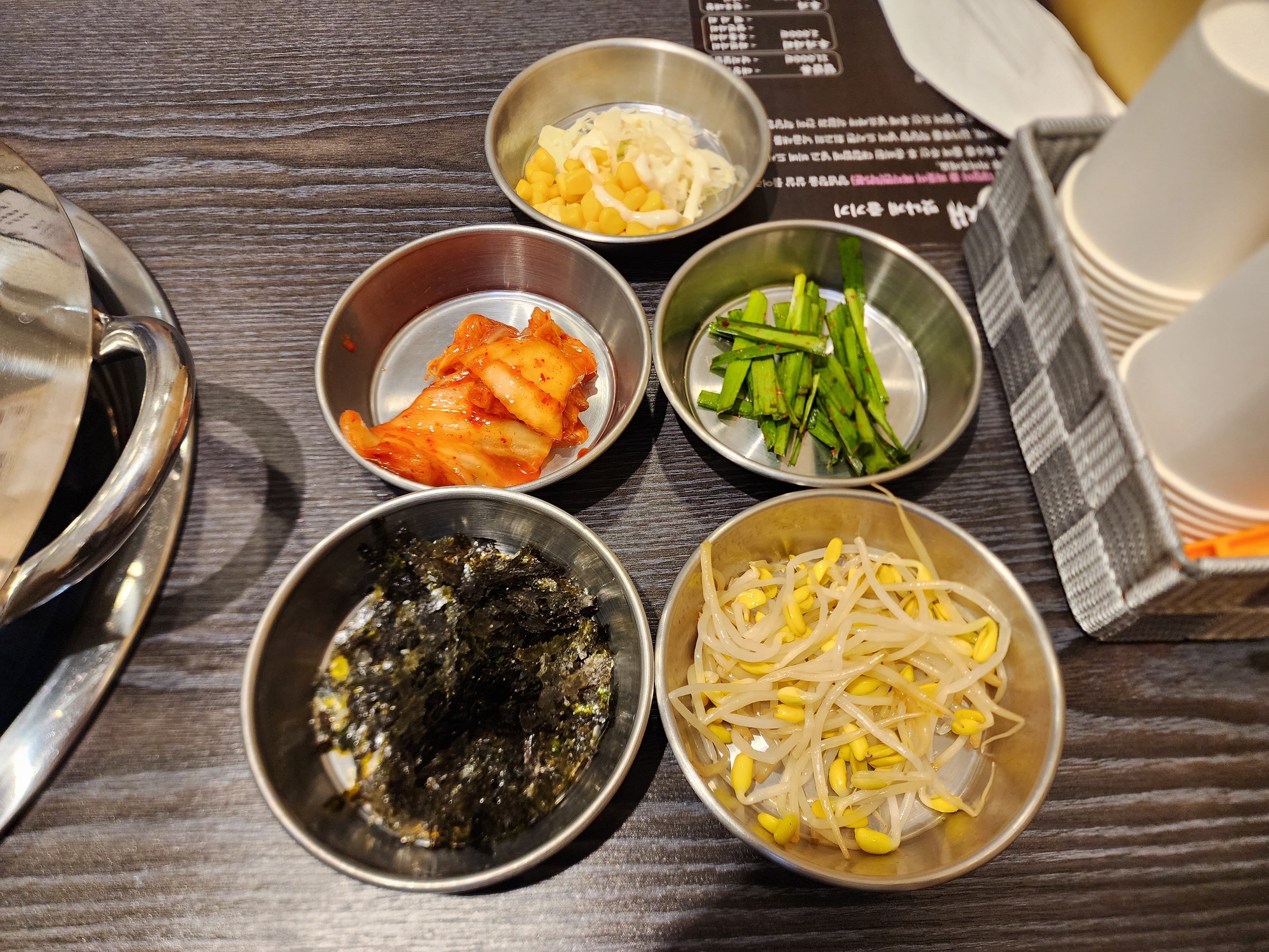 김가루, 콩나물무침, 부추무침, 김치, 콘샐러드, 물김치가 나오더군요.