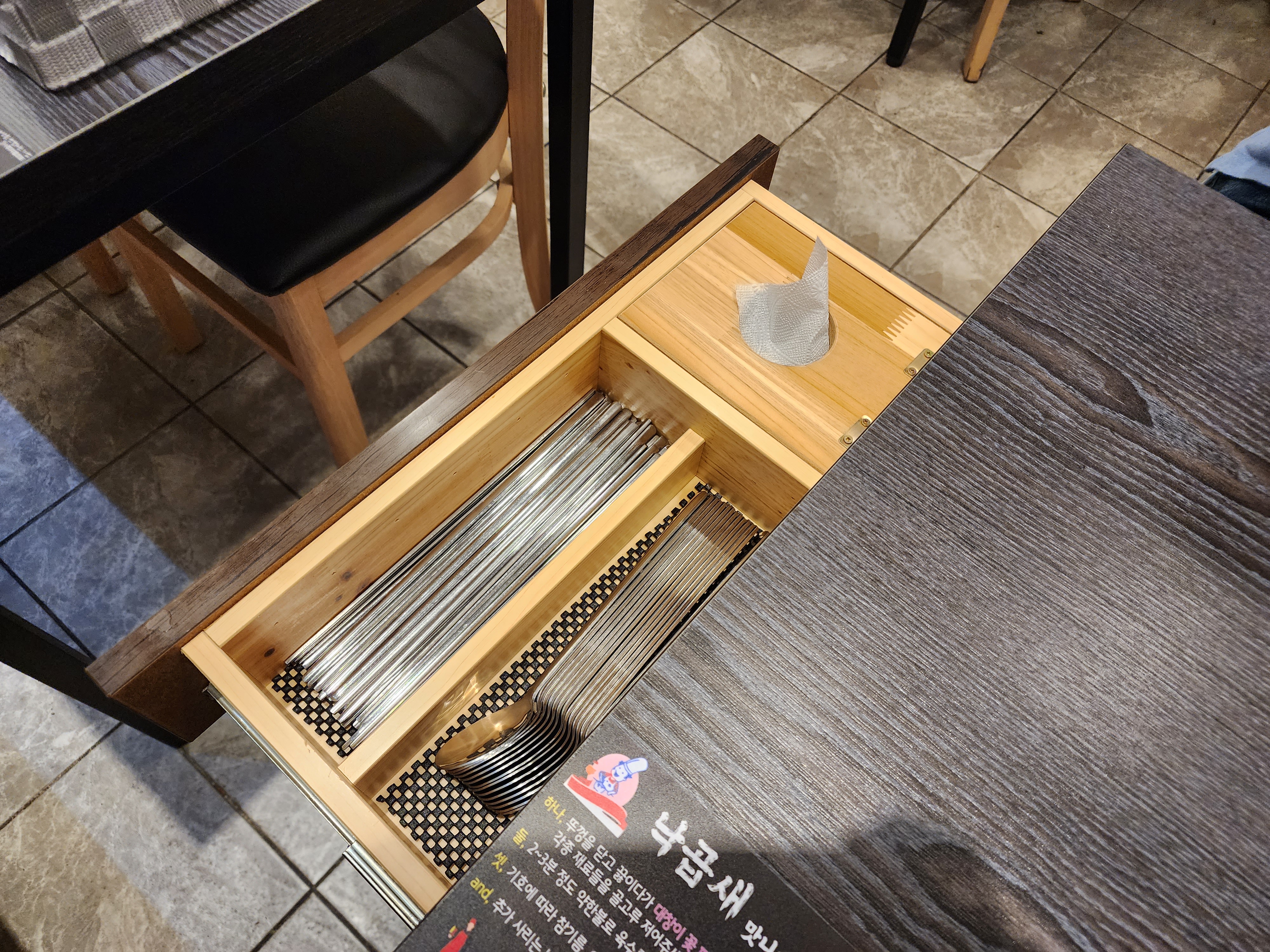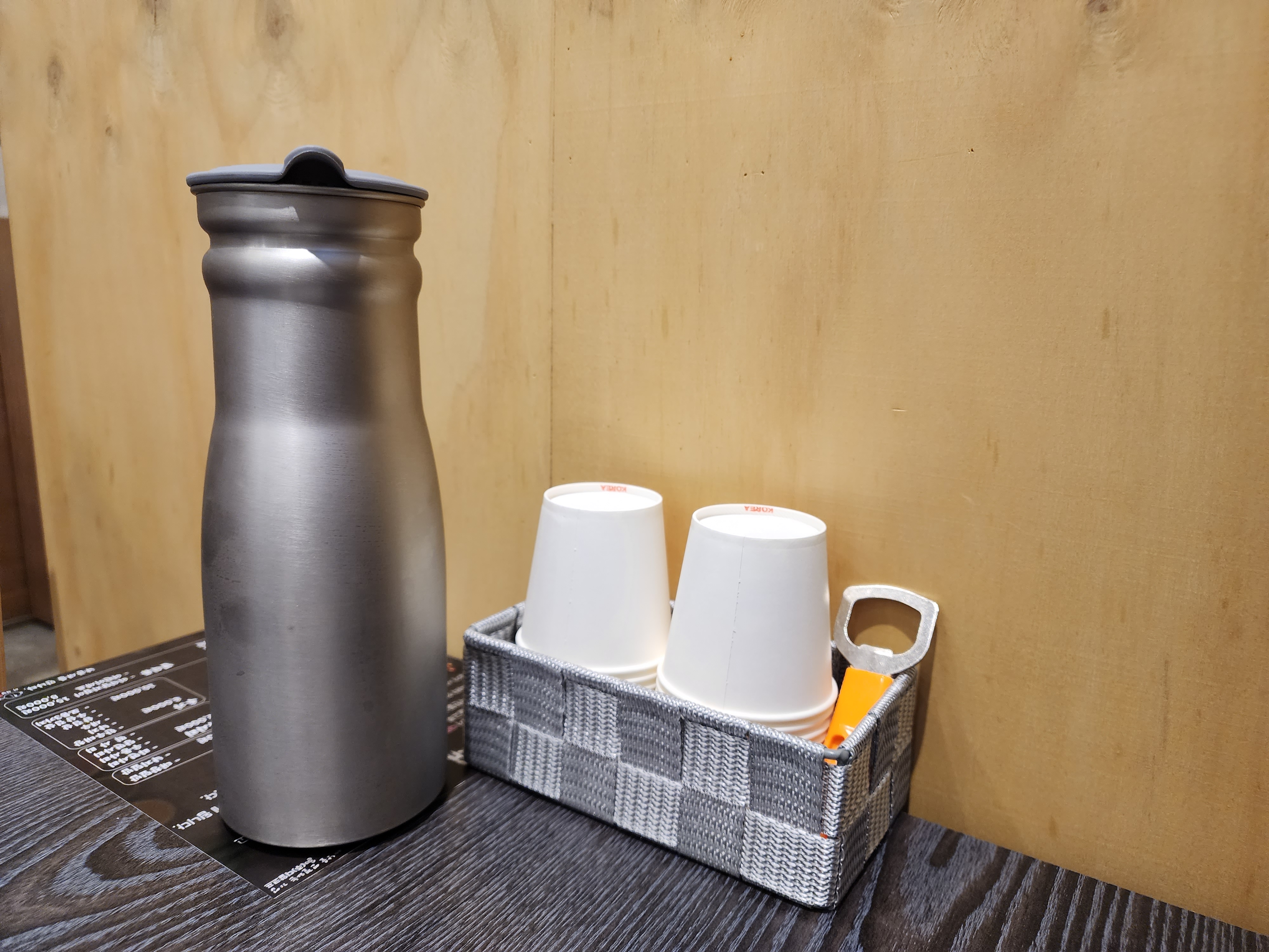 테이블엔 종이컵, 병따개, 서랍엔 냅킨, 수저와 젓가락이 있었고 아이 식기는 따로 가져다 주셨어요.