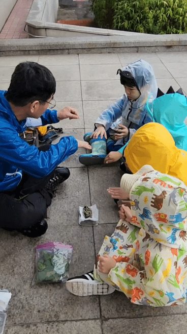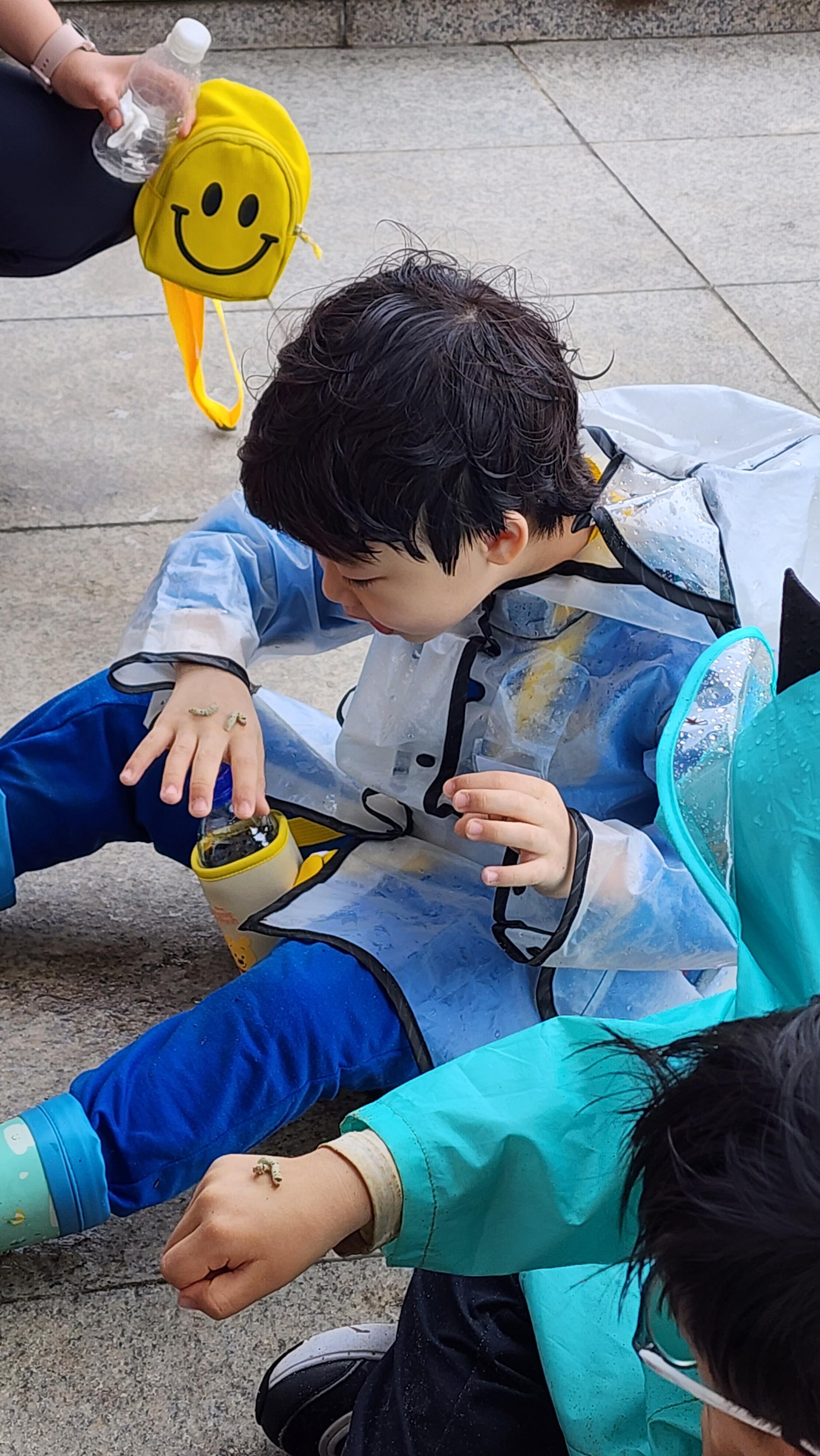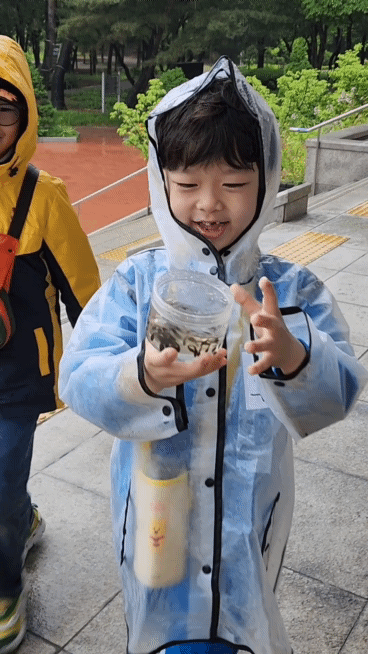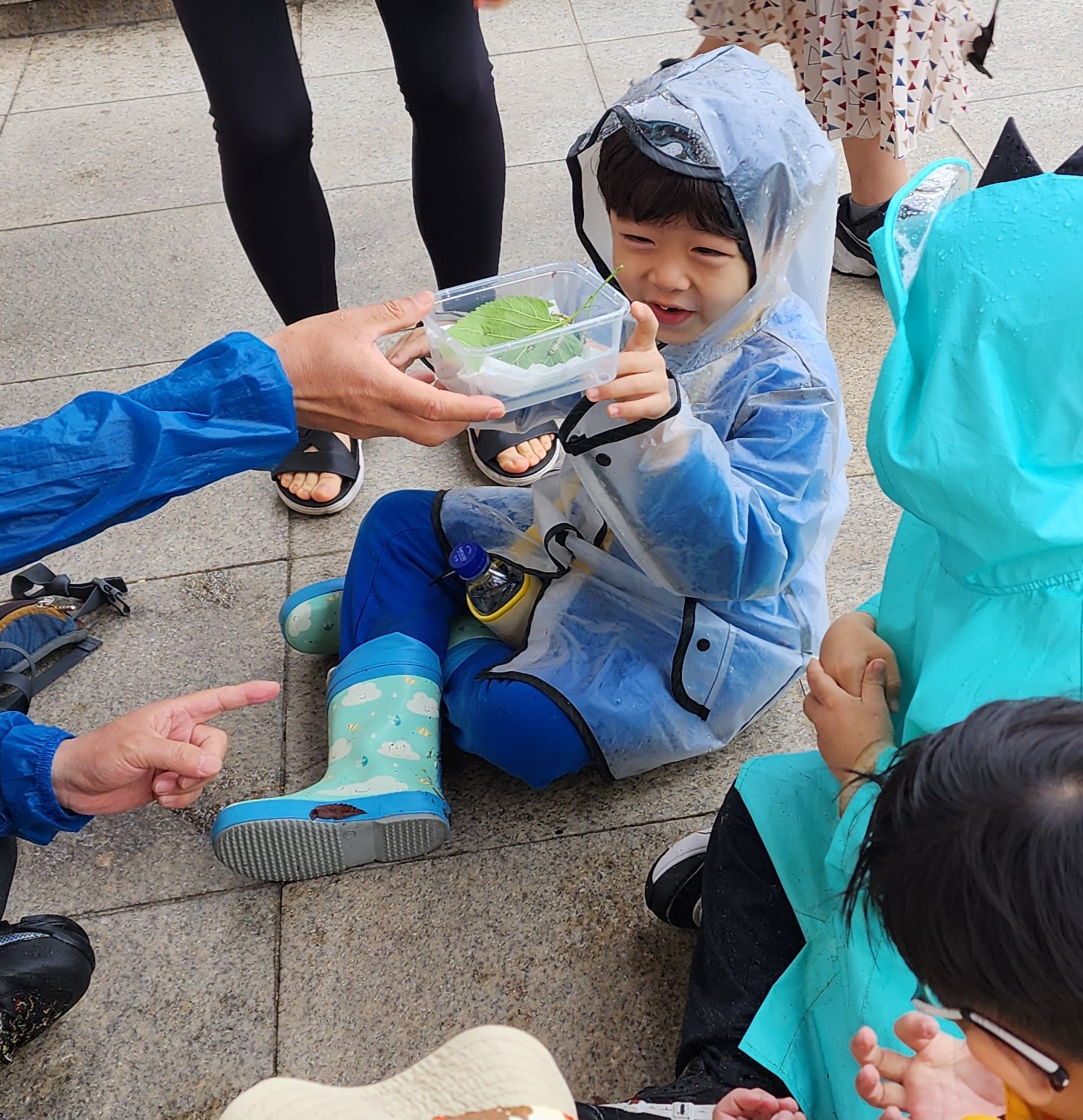선생님께서 곤충채집 할 수 있는 도구들을 다 준비해서 아이들을 나눠주셨었는데 빗속에서 신나게 곤충 채집 체험을 하더라고요.