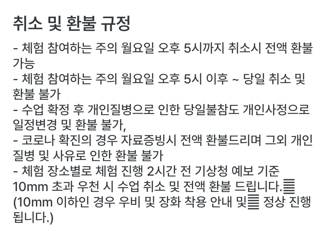 체험장소별로 체험진행 2시간 전 기상청 예보기준 10mm 초과 우천시 수업취소 및 전액환불