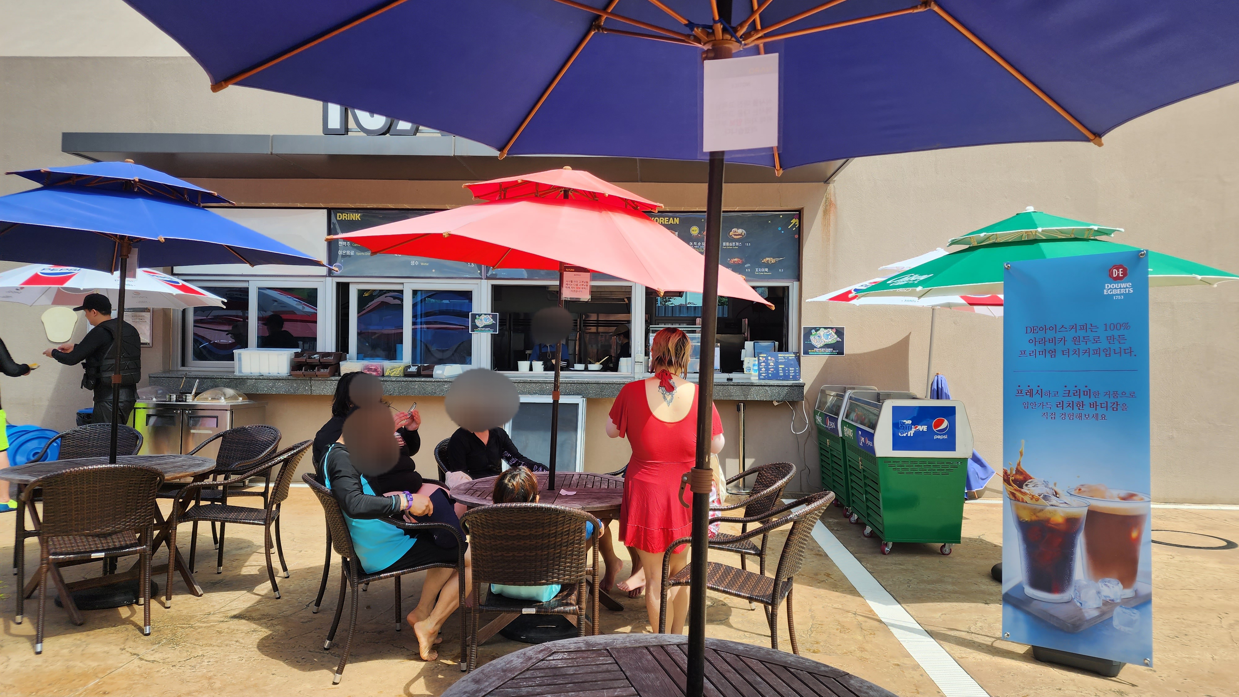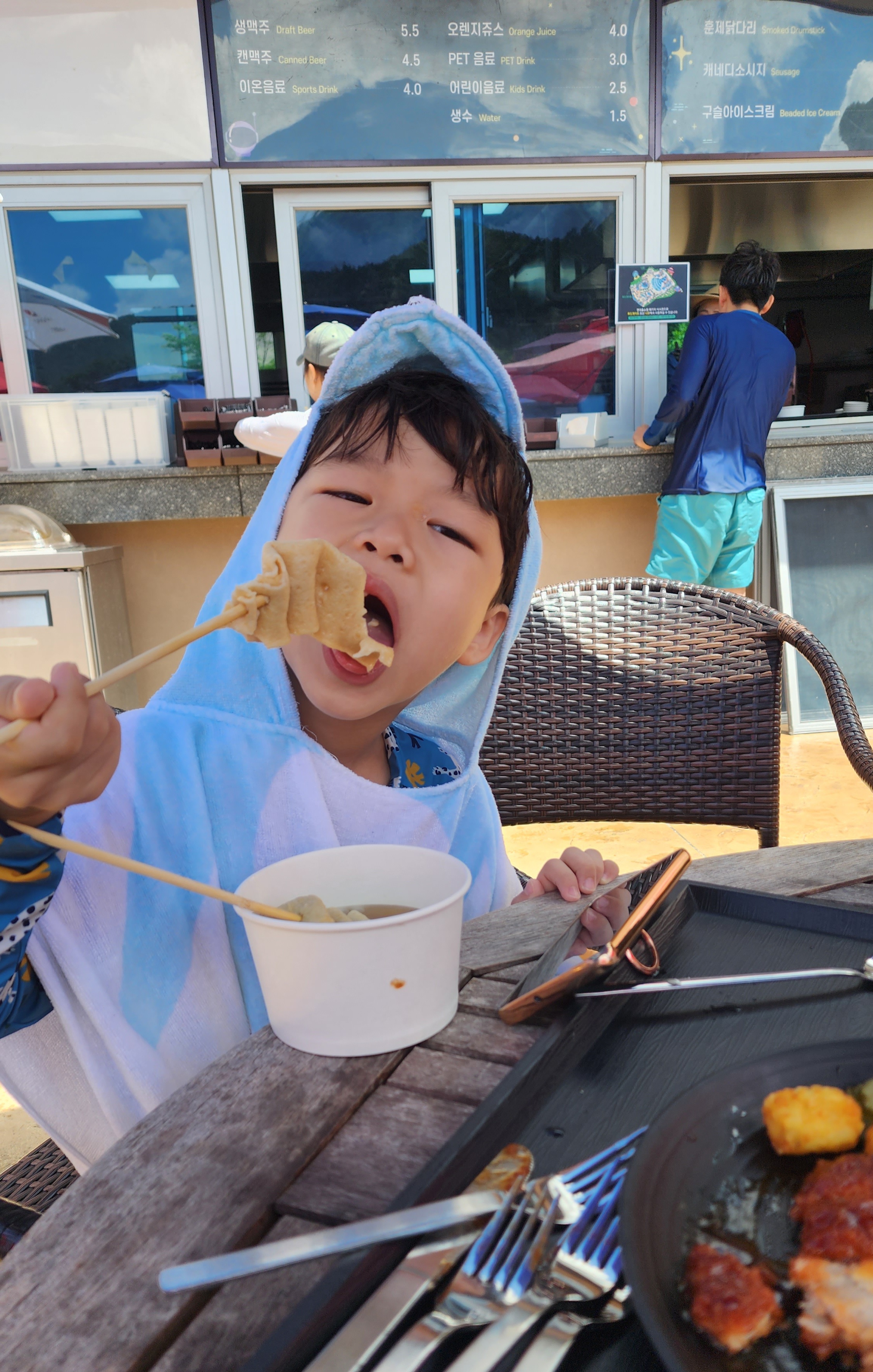 단체이용객이 있으면 실내 식당은 이용이 어려워서 외부에 있는 식당 이용하시라는 안내 받으실 수 있을 텐데요 동글이가 물놀이 후에 식사하면서 에어컨 바람 쏘이면 춥다고 하는 친구라 밖에서 먹는게 나았던 것 같아요.