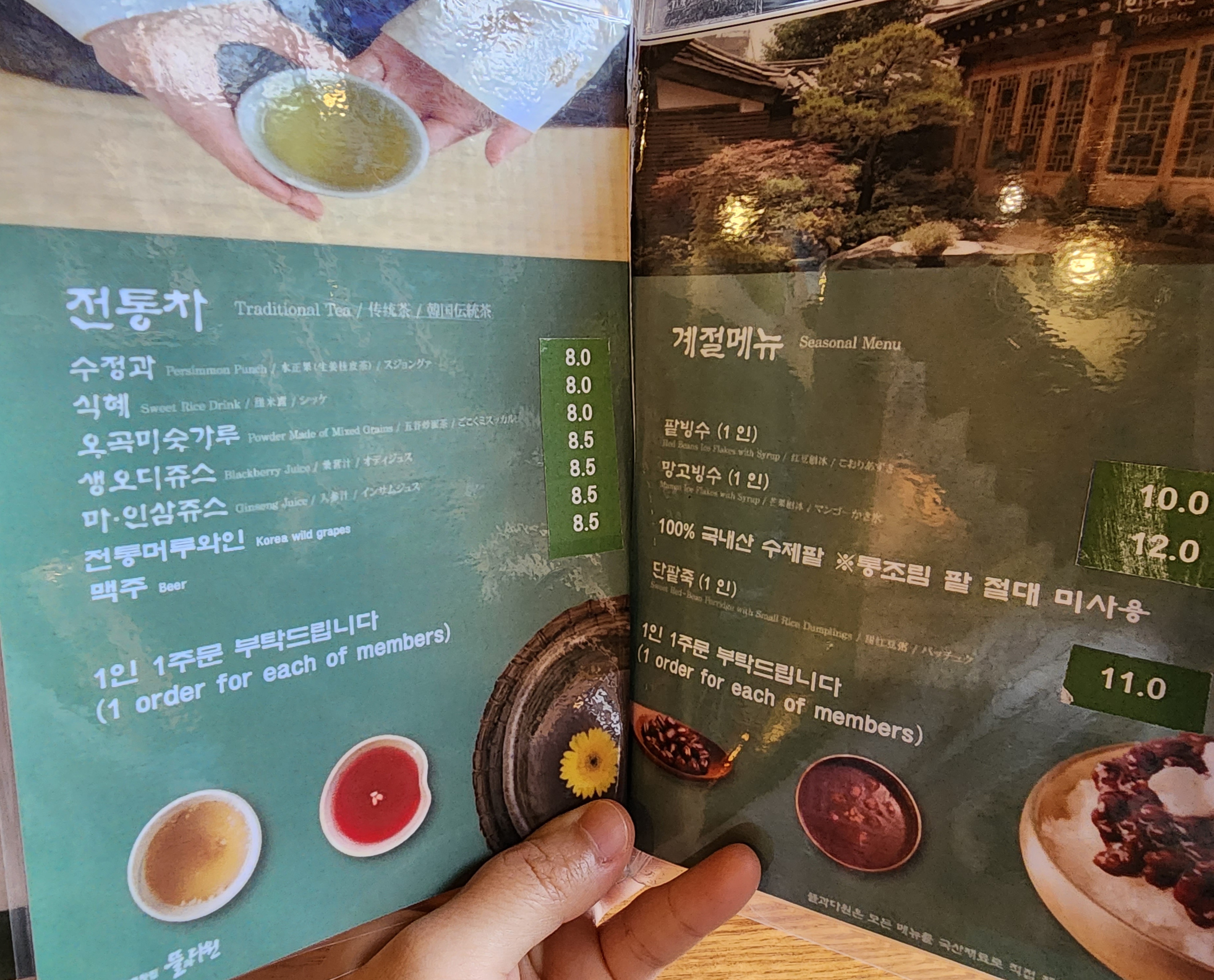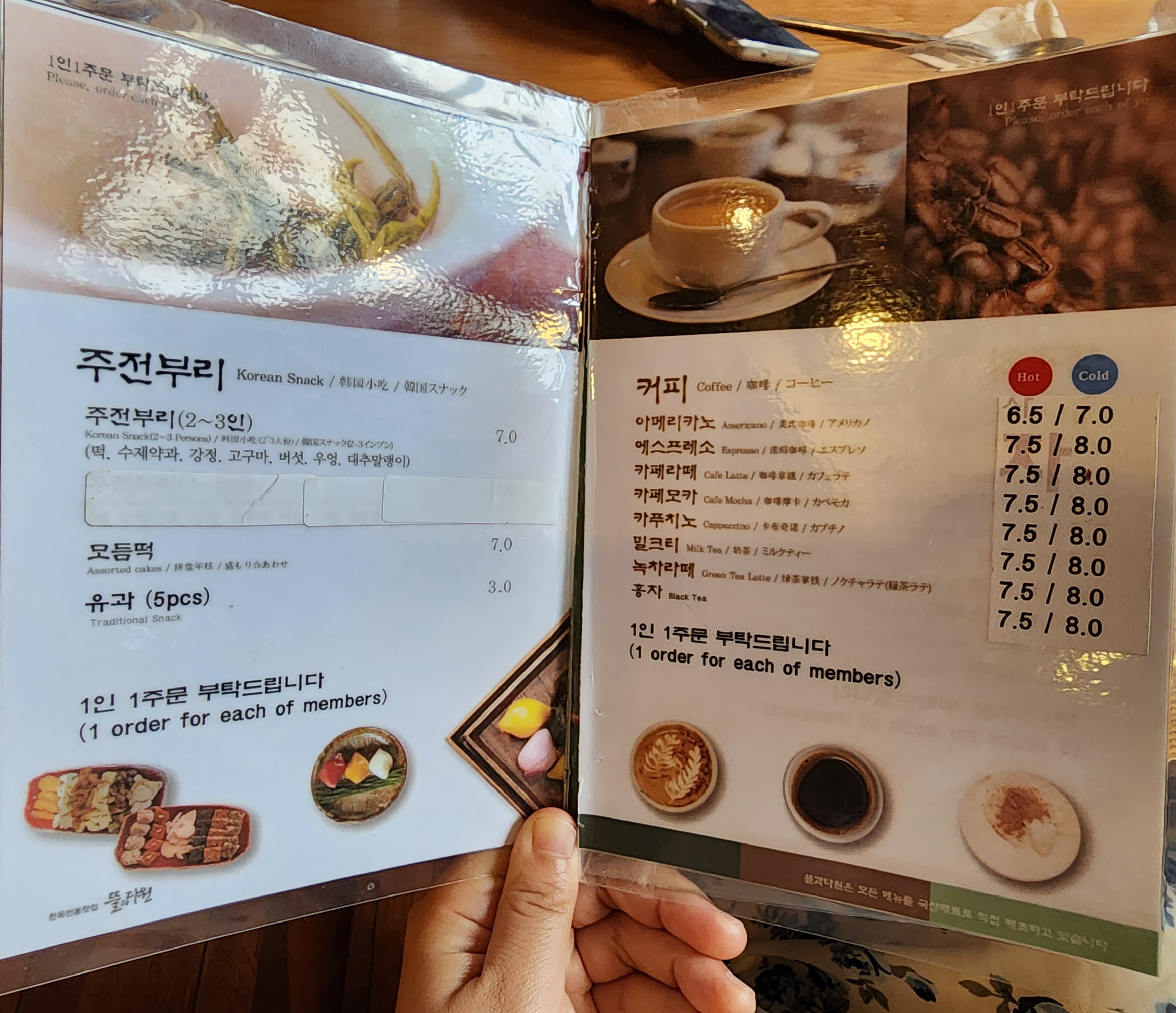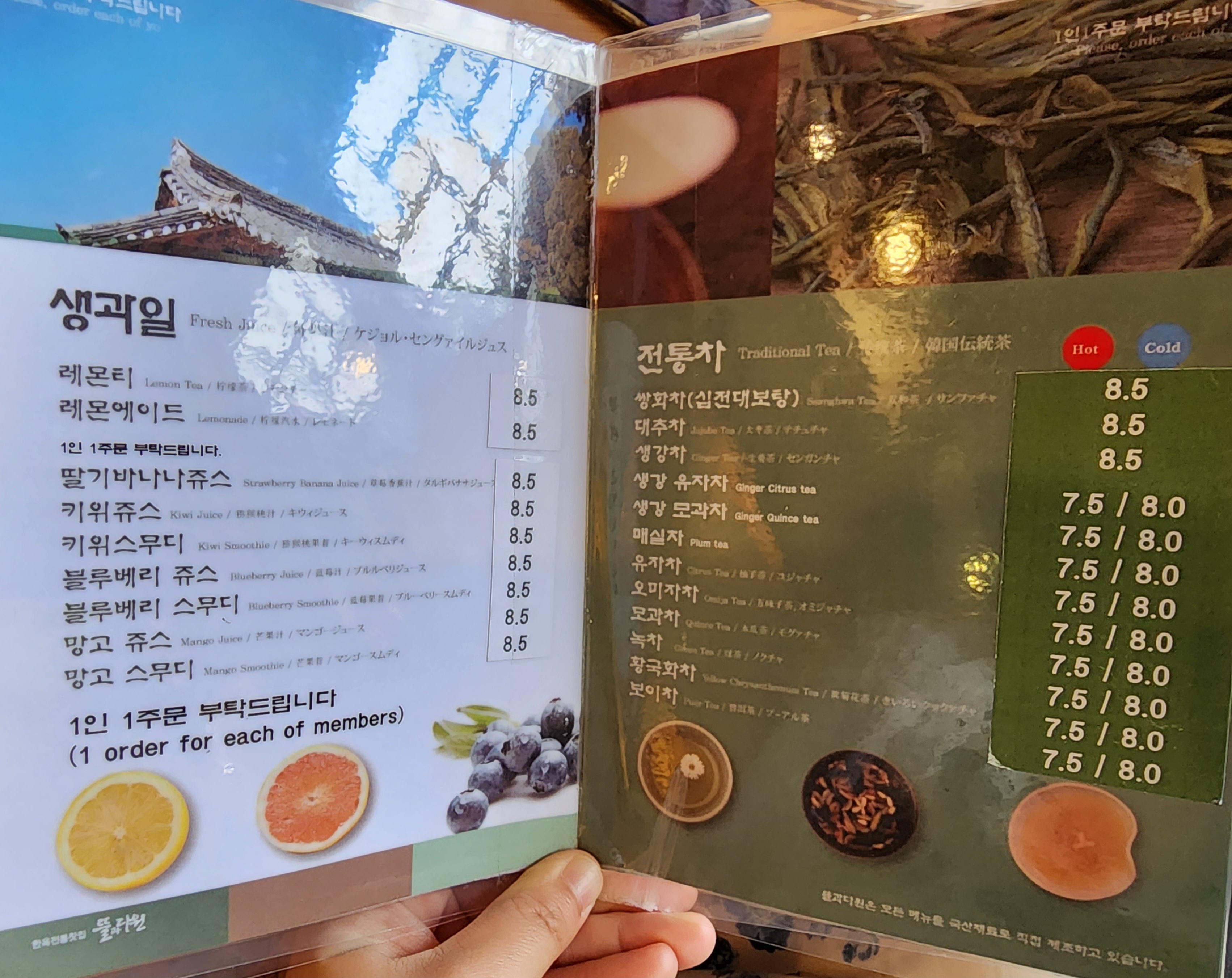 주전부리, 커피, 생과일, 전통차, 계절메뉴 등 다양해서 취향껏 고르면 되겠더군요.