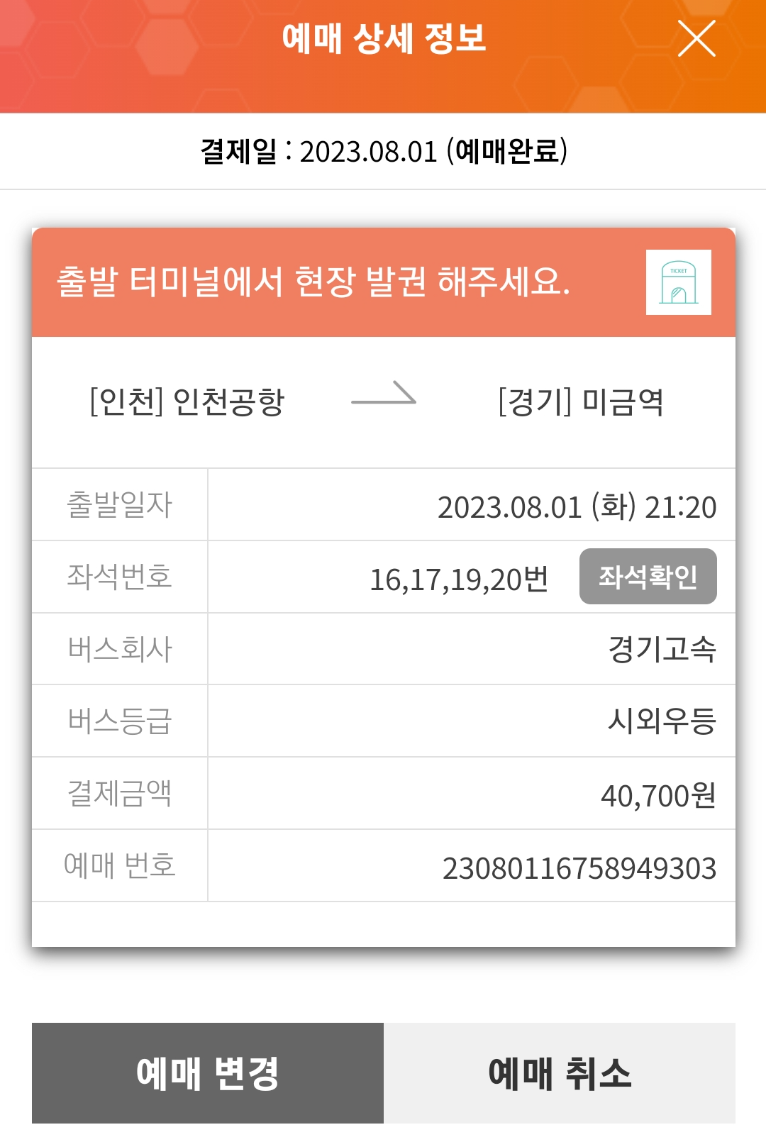 버스타고 어플 통해서 예매 했기 때문에 예매내역으로 승차권을 발권했어요.