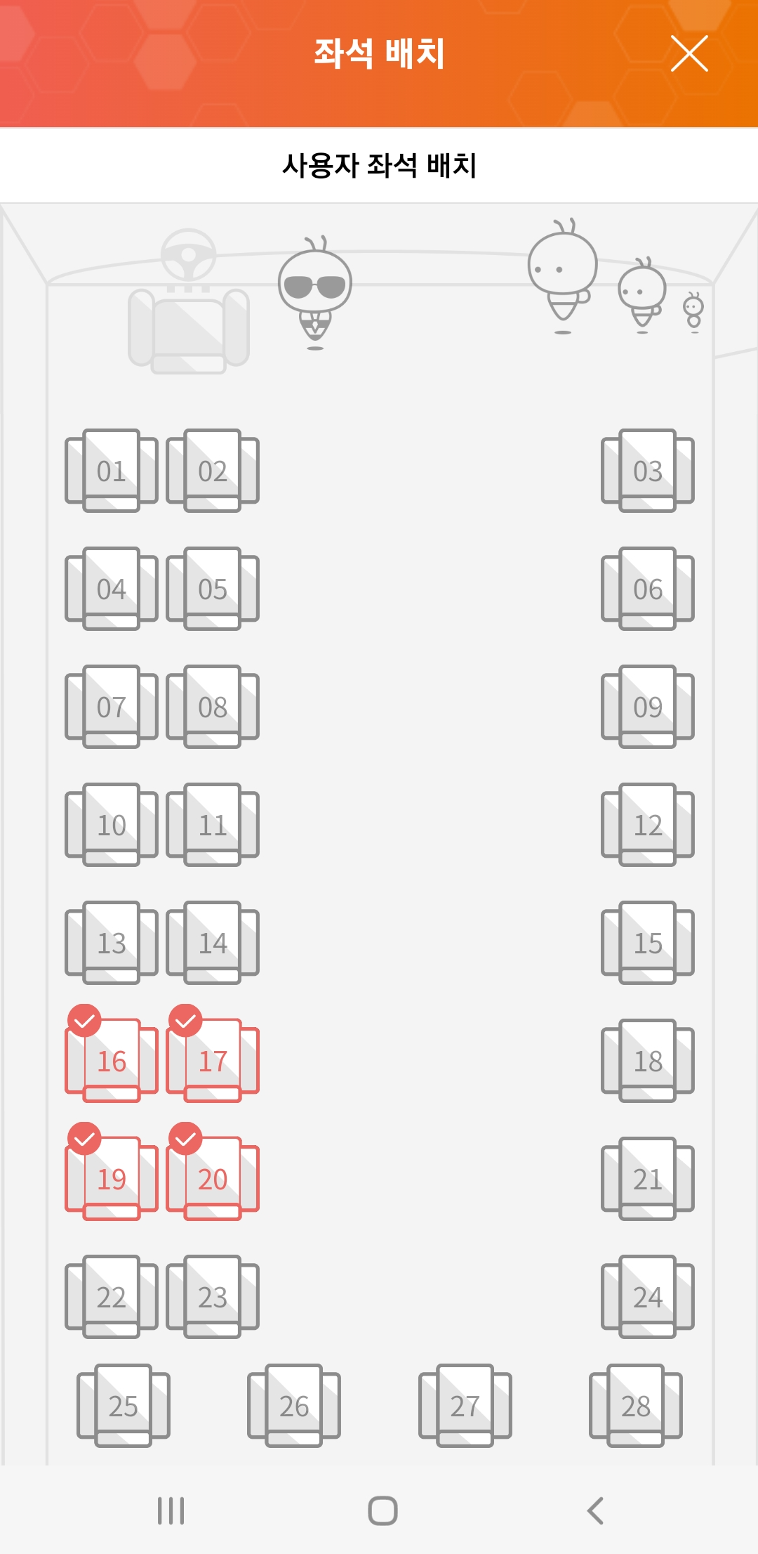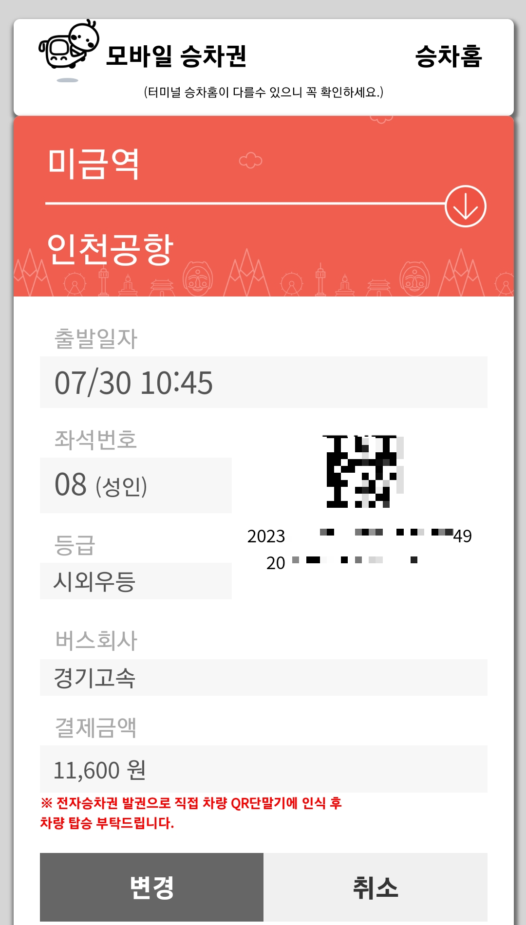 좌석도 선택 가능하고요, 예약 후 QR코드 발권이 되는데 버스 탈 때 기사님께 확인 태그 하고 탑승하시면 됩니다.