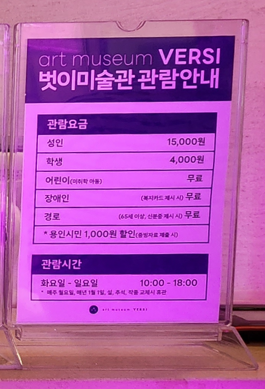 성인 15,000원 / 학생 4,000 / 어린이(미취학아동), 장애인, 경로(65세이상 신분증 제시 시) 무료