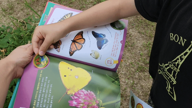 꽃을 관찰하다가 팔랑팔랑 나비가 날아오는걸 발견하고는 "엄마! 나비" 하면서 나비 페이지에도 스티커를 붙이더군요.