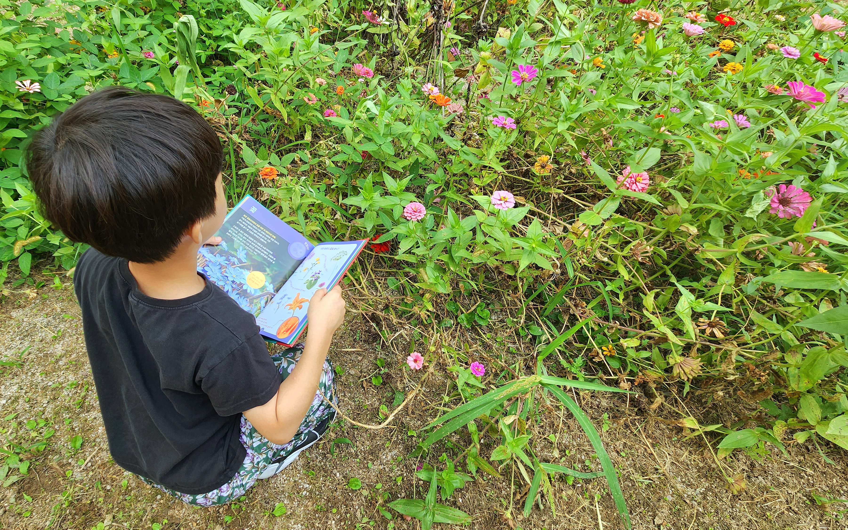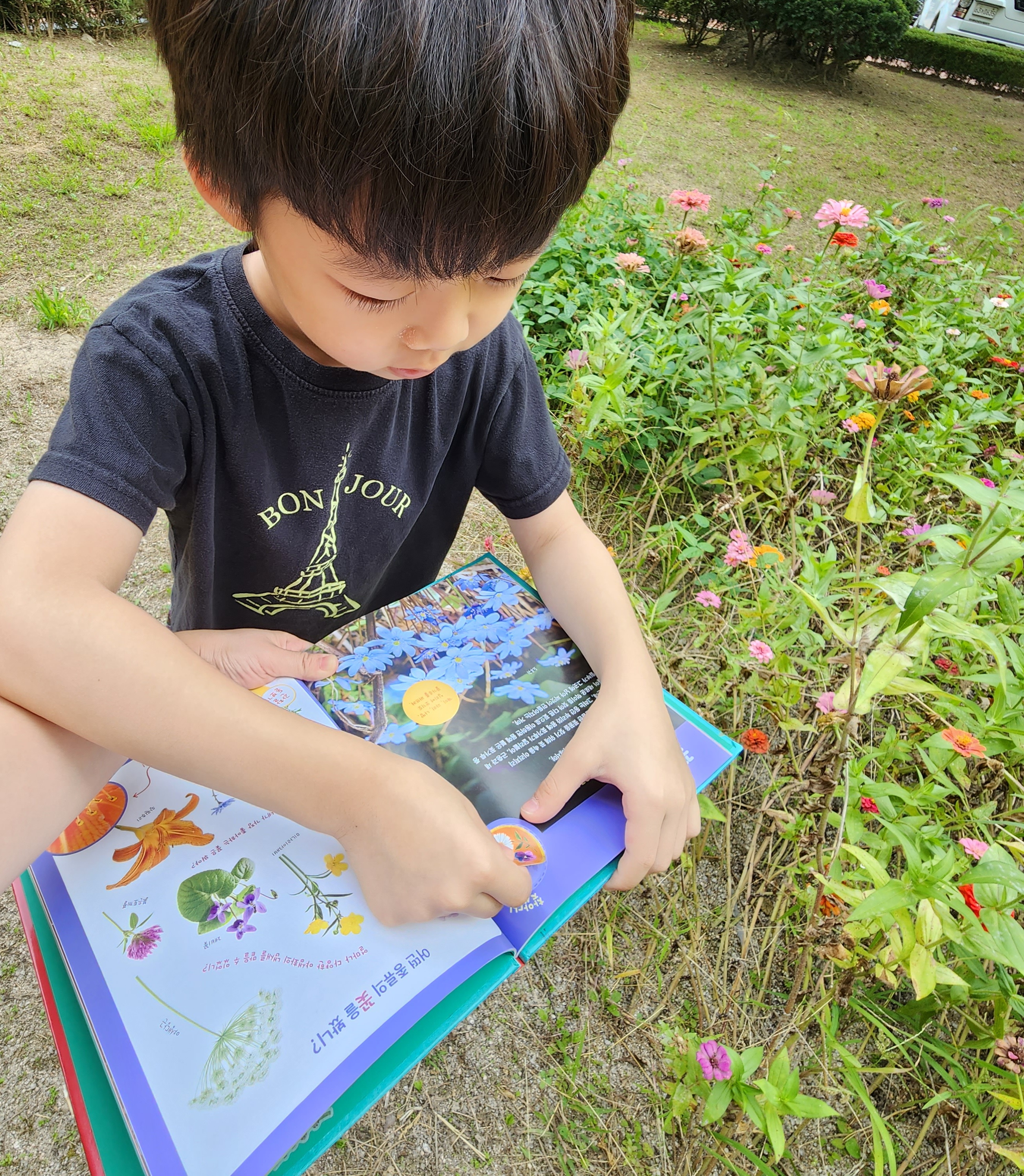 꽃이 피어있는 걸 보고 재빠르게 책을 펼쳐드는 동글이였어요.